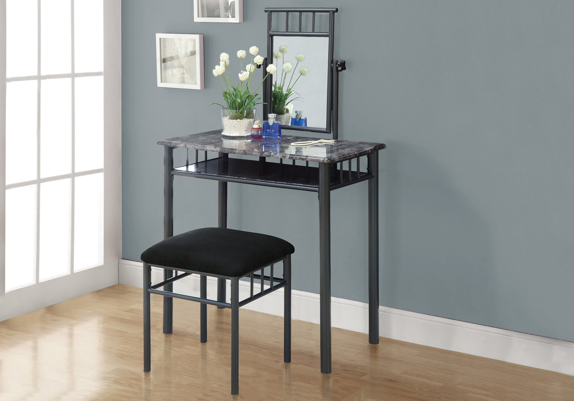 I3062 VANITY SET - 2PCS SET / GREY MARBLE / CHARCOAL METAL MONARCH SPECIALTIES  I3062