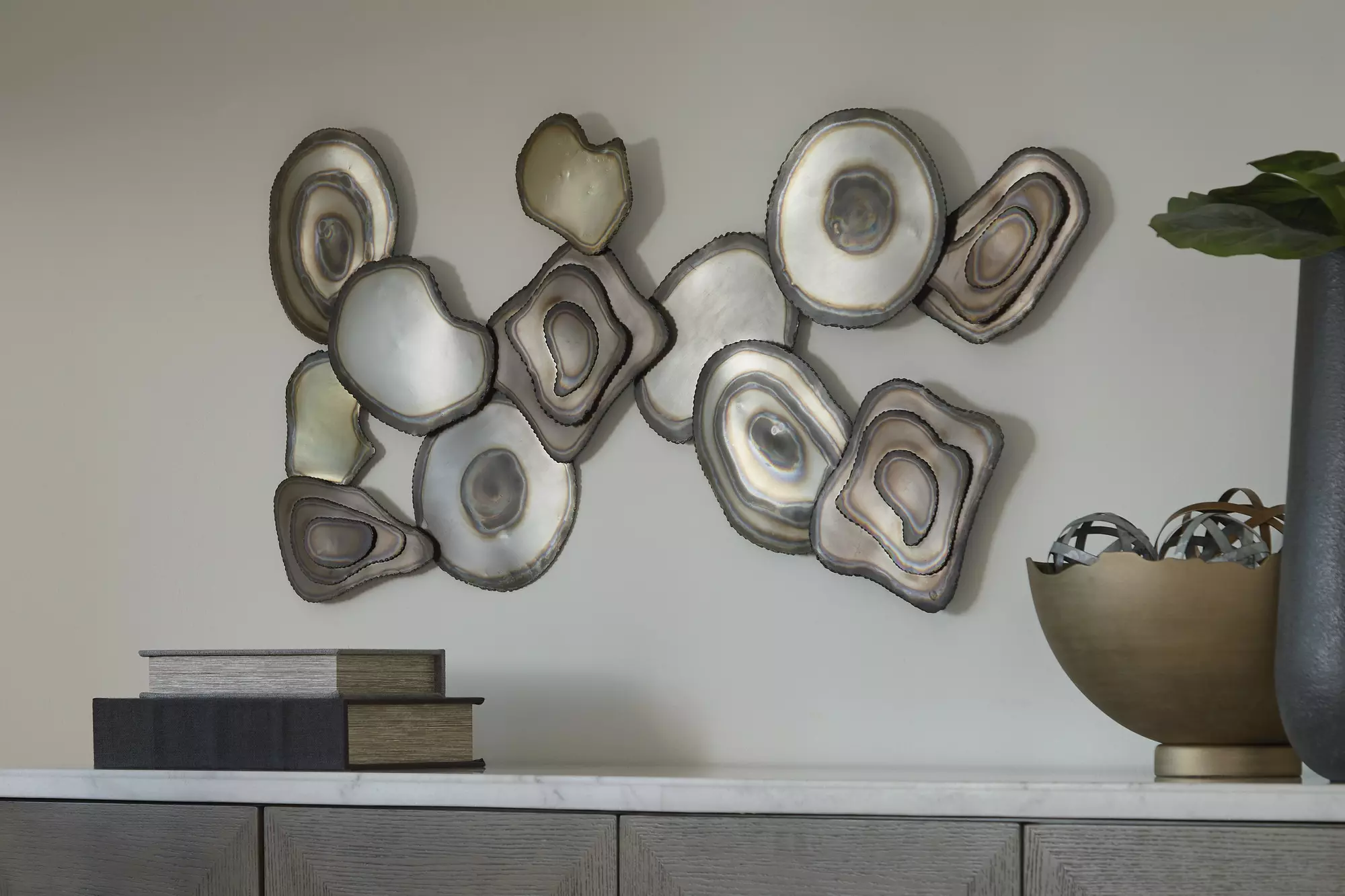 DescriptionMetallic finishes create an eye-catching interplay of light and dimension in this wall decor. The abstract design and organic shapes lend a sophisticated, contemporary edge, while its ability to hang four ways offers impressive versatility. Whether it's adorning your dining room, home office or living room, this sculptural piece doesn't just decorate—it captivates.