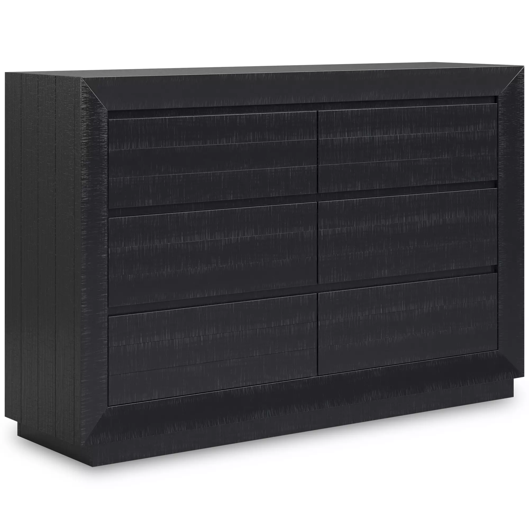 Product DetailsMade with pine solids, veneers and engineered wood substrate | Textured black wood stain with waxy topcoat | Hardware-less design | 6 drawers with fully finished interiors, dovetail construction and ball-bearing side glides (top drawers with felt-lined bottoms)