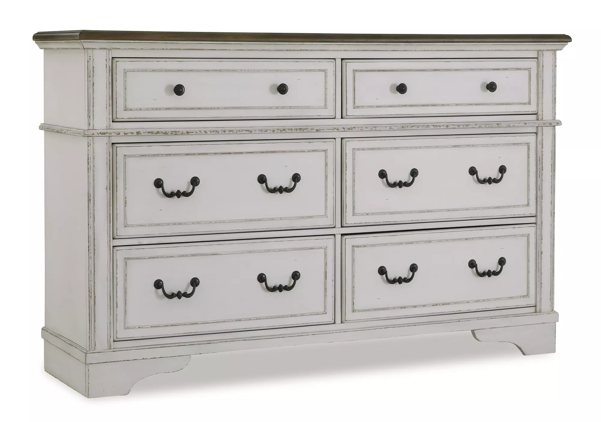Product DetailsMade with hardwood solids, select wood veneer and MDF substrate | Two-tone finish (chipped white with brown wood-tone top) | Profiled drawer fronts and pilasters | Waist moulding | Metal hardware with dark bronze-tone finish | 6 smooth-gliding drawers with fully finished interiors, dovetail construction and metal ball-bearing side glides (top drawers felt lined) | Assembly required