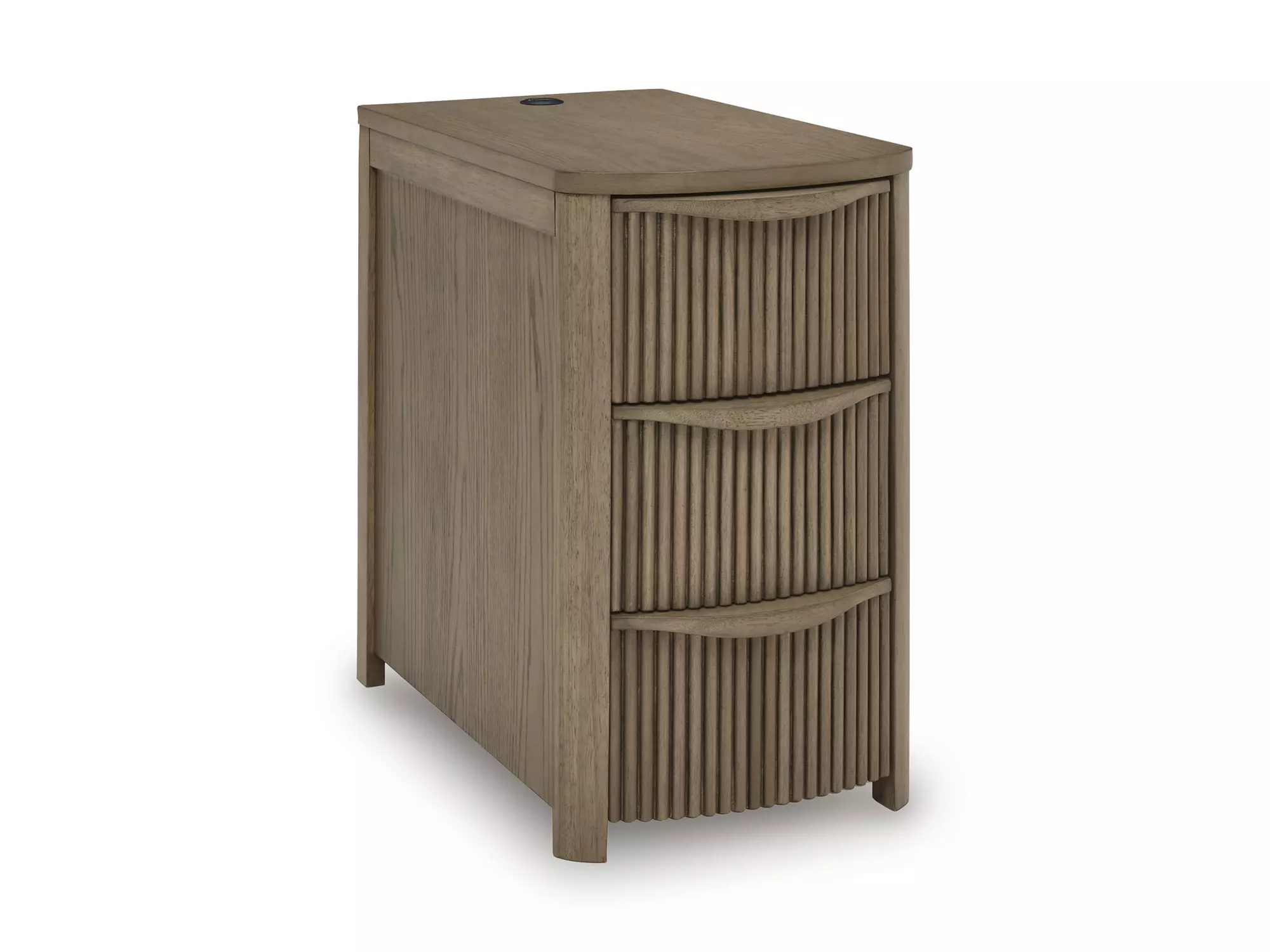 DescriptionThis chairside end table elevates your living room with both sleek style and must-have modern function. Reeded detailing lends a contemporary appeal, while subtly integrated drawers stow essentials with ease. USB ports round out the design, allowing you to keep devices within reach while charging.