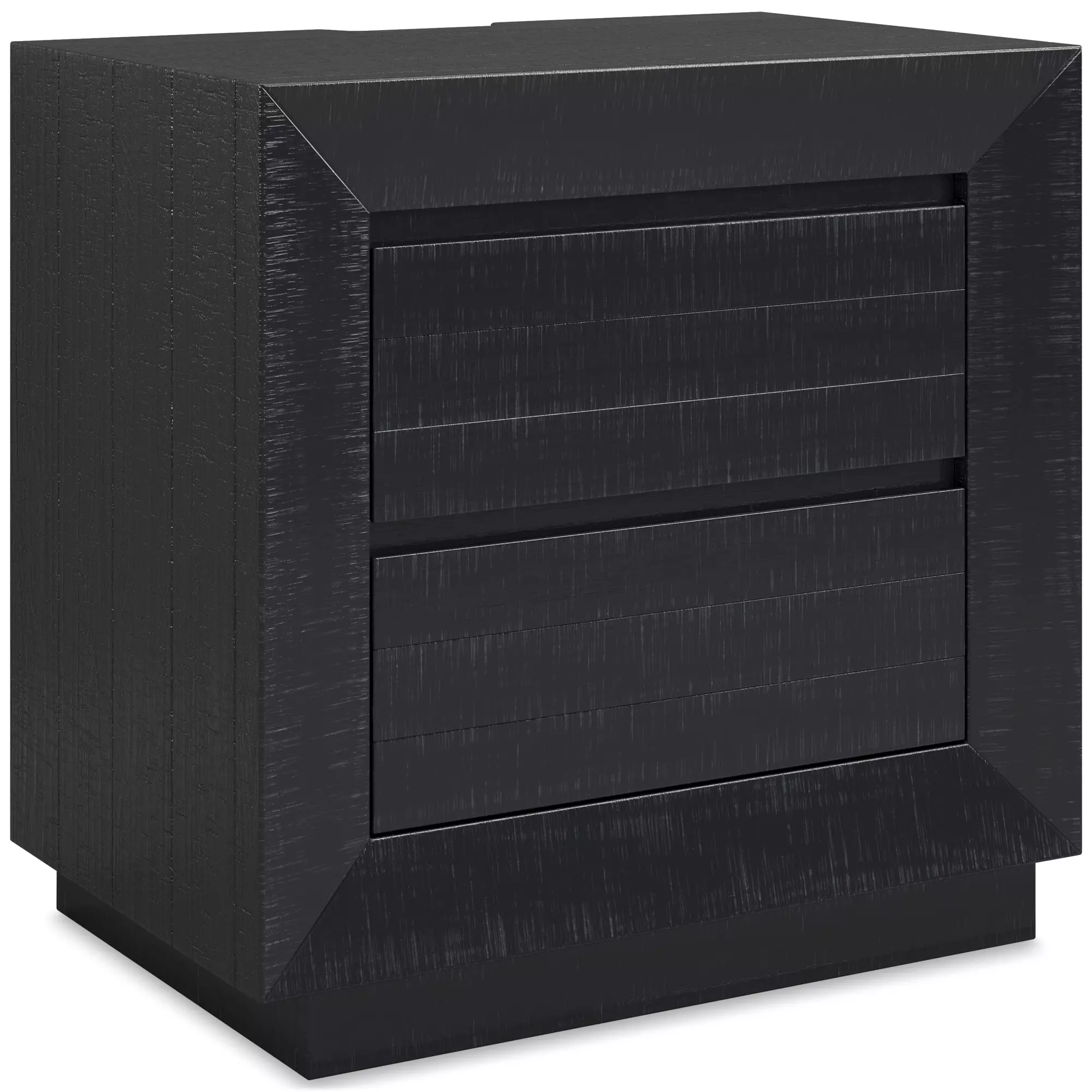 Product DetailsMade with pine solids, veneers and engineered wood substrate | Textured black wood stain with waxy topcoat | Hardware-less design | 2 drawers with fully finished interiors, dovetail construction and ball-bearing side glides | 110V power supply with dual USB charging ports | Power cord included; UL Listed