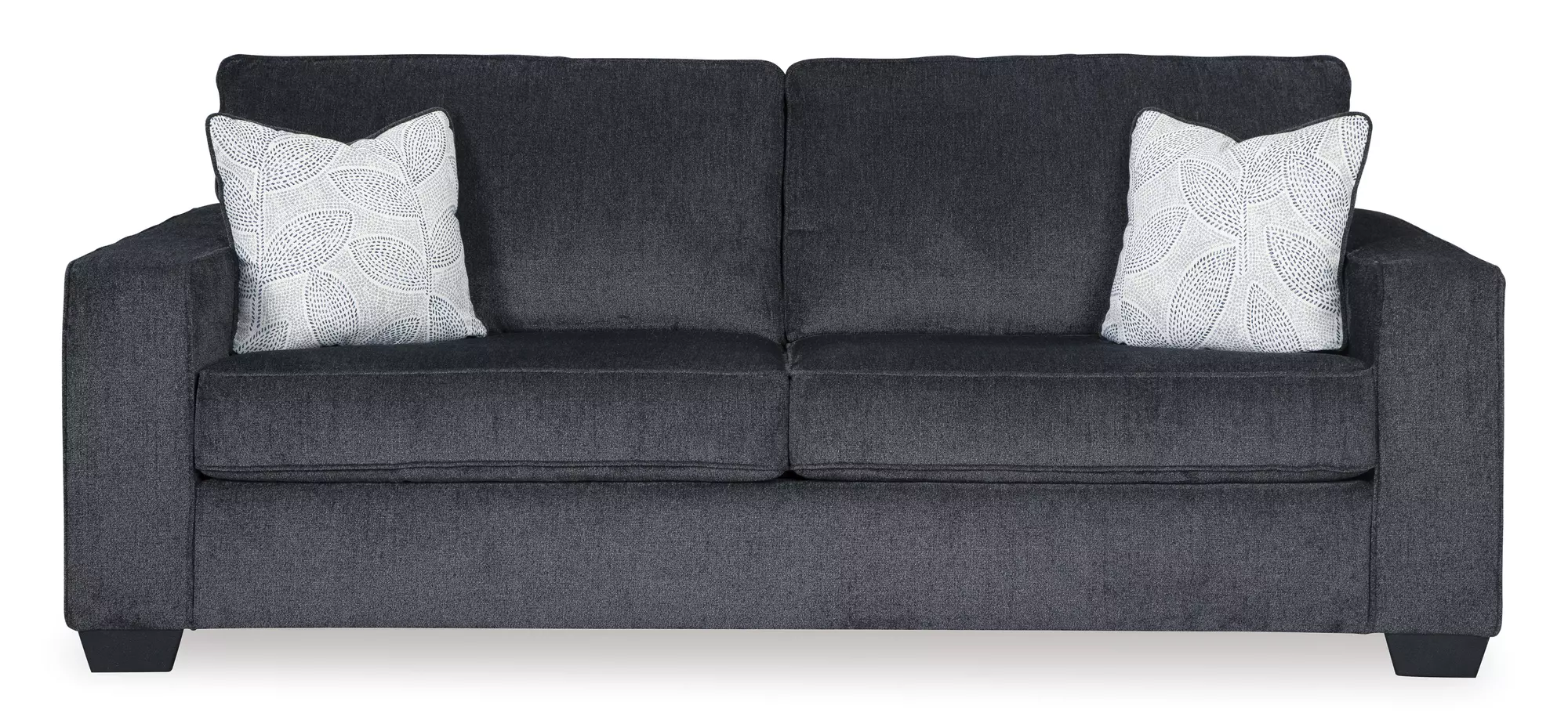 DescriptionIf style is the question, then this sofa is the answer. Sporting clean lines and sleek track arms, the decidedly contemporary profile is enhanced with plump cushioning and a chenille-feel upholstery that's so pleasing to the touch. Sure to play well with so many color schemes, this sofa in slate gray includes a pair of understated floral pattern pillows for fashionably fresh appeal.