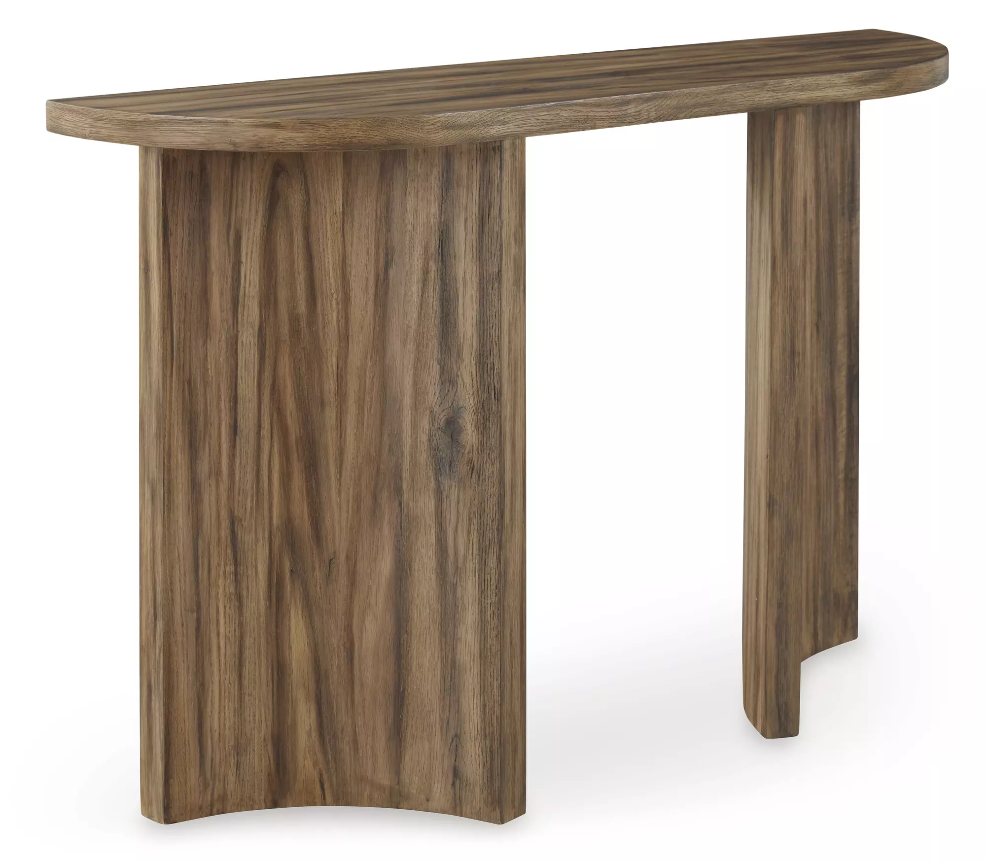 DescriptionShowcasing an elevated, artistic silhouette, this sofa table expertly blends modern form and function. Its warm brown finish highlights the stunning wood grain, bringing an earthy element to staging your decor or a sofa-side lamp. Complete with a thick, substantial top, it’s a naturally beautiful living room staple in the making.