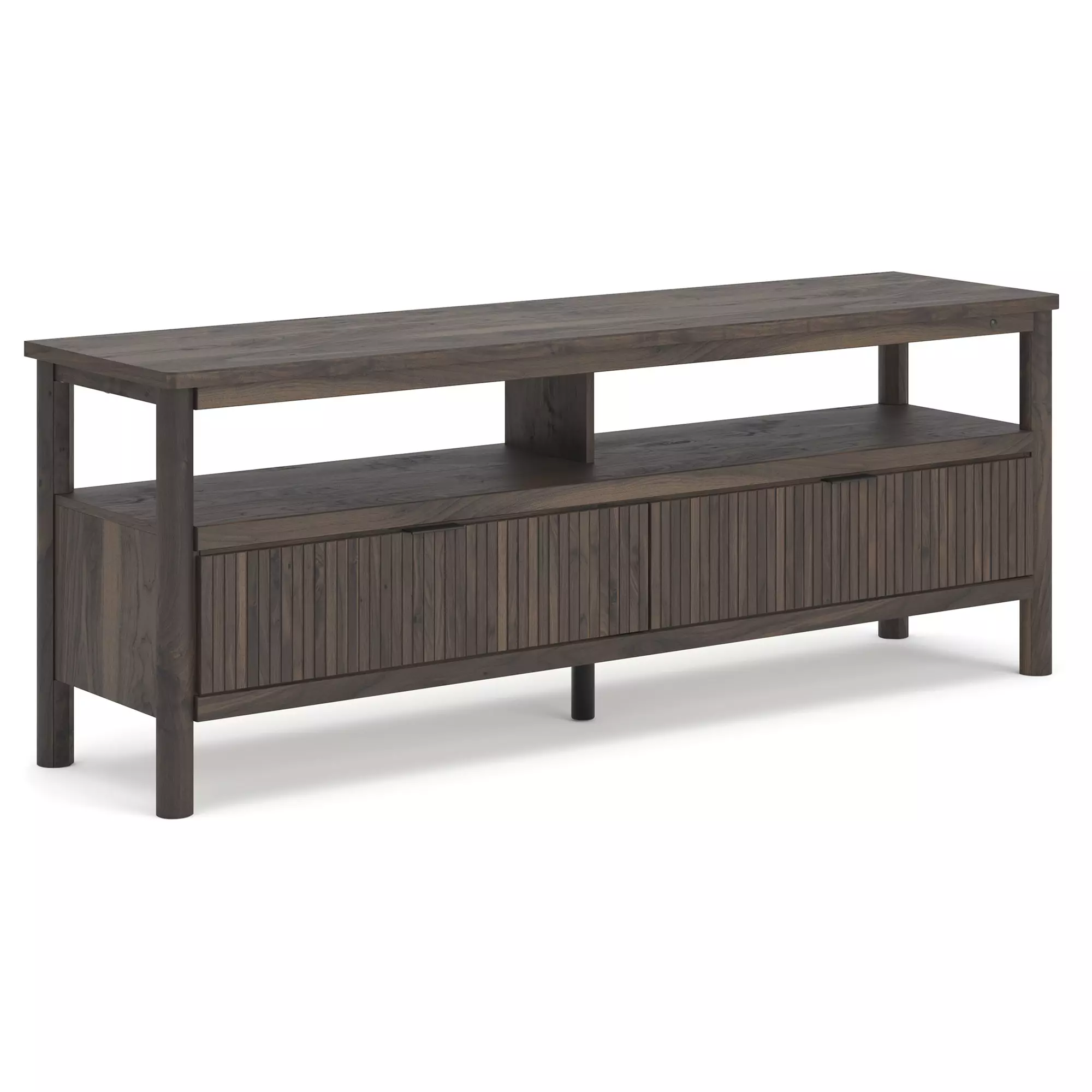 DescriptionCrafted with both form and function in mind, this TV stand brings a dash of retro-cool character to your modern boho aesthetic. A reeded design on its drawers adds an on-trend touch to storing entertainment essentials. Warmly welcoming with a rich brown finish, the TV stand pairs well with muted hues, earth tones and other neutrals alike. And for added ambiance, lighting under the top brings a cool vibe to your favorite shows or video gaming. What a refined take on easygoing style.