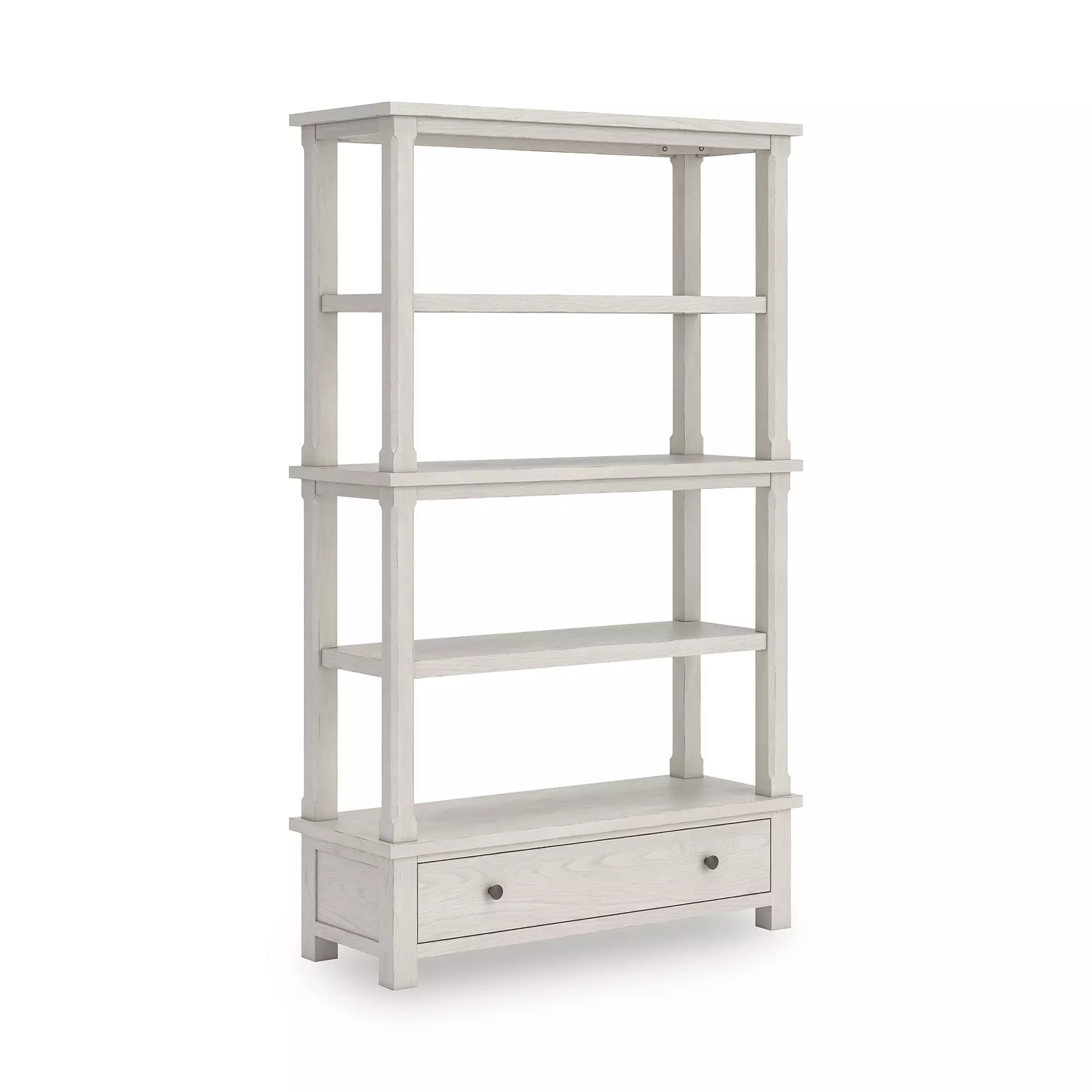 Product DetailsMade with hardwood solids, oak veneer and MDF substrates | Antiqued white finish with wood grain texture | Round metal knobs with aged pewter-tone finish | 4 fixed shelves | Smooth-gliding drawer | Assembly required