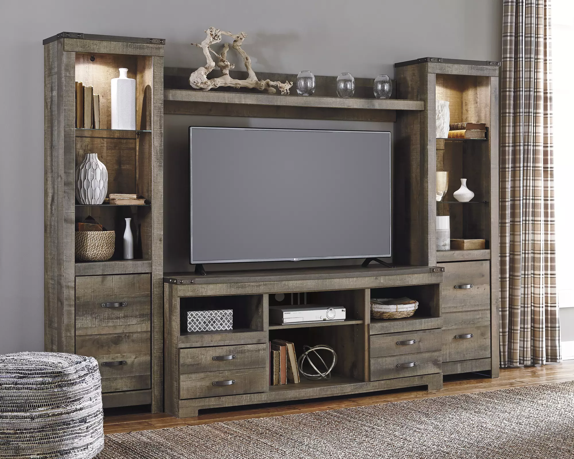 Assembled entertainment center: Width:104.5 in Depth:20.75 in Height:73.25 in