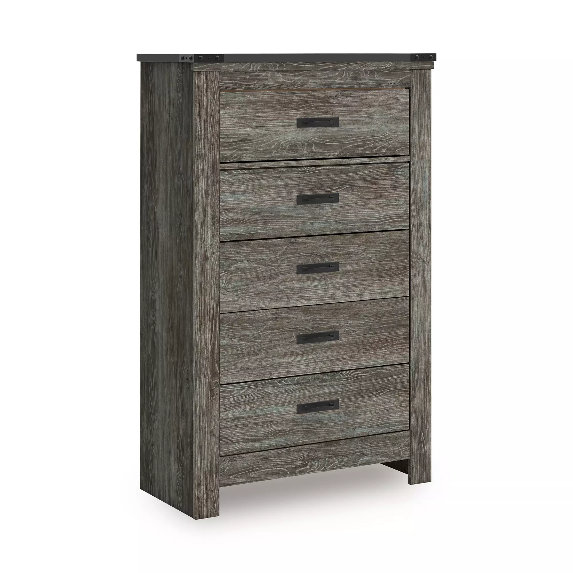 Product DetailsMade with engineered wood (MDF/particleboard/plywood) and decorative laminate for the right balance of affordability and durability | Rustic warm gray finish over replicated oak grain with authentic touch | Decorative laminate replicates natural or man-made material surfaces with consistent color, pattern and texture | Matte black drawer handles | 5 smooth-gliding drawers | Safety is a top priority, clothing storage units are designed to meet the most current standard for stability, ASTM F 2057 (ASTM International) | Drawers extend out to accommodate maximum access to drawer interior while maintaining safety | Minor assembly required