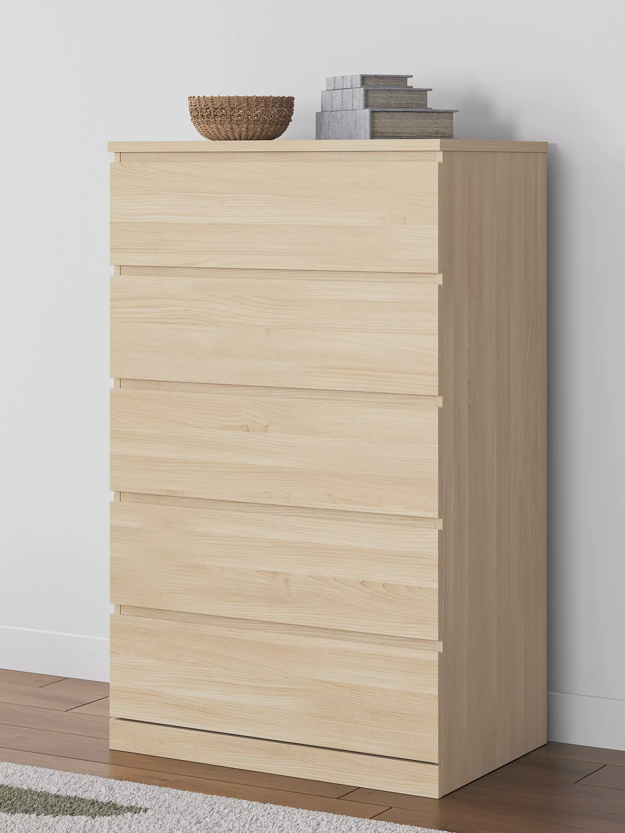 Made with engineered wood (MDF/particleboard/plywood) and decorative laminate for the right balance of affordability and durability | Natural finish over replicated ash grain with authentic touch | Decorative laminate replicates natural or man-made material surfaces with consistent color, pattern and texture | 5 smooth-gliding drawers with ball-bearing side glides; vinyl-wrapped sides and back for durability | Safety is a top priority, clothing storage units are designed to meet the most current standard for stability, ASTM F 2057 (ASTM International) | Drawers extend out to accommodate maximum access to drawer interior while maintaining safety | Assembly required