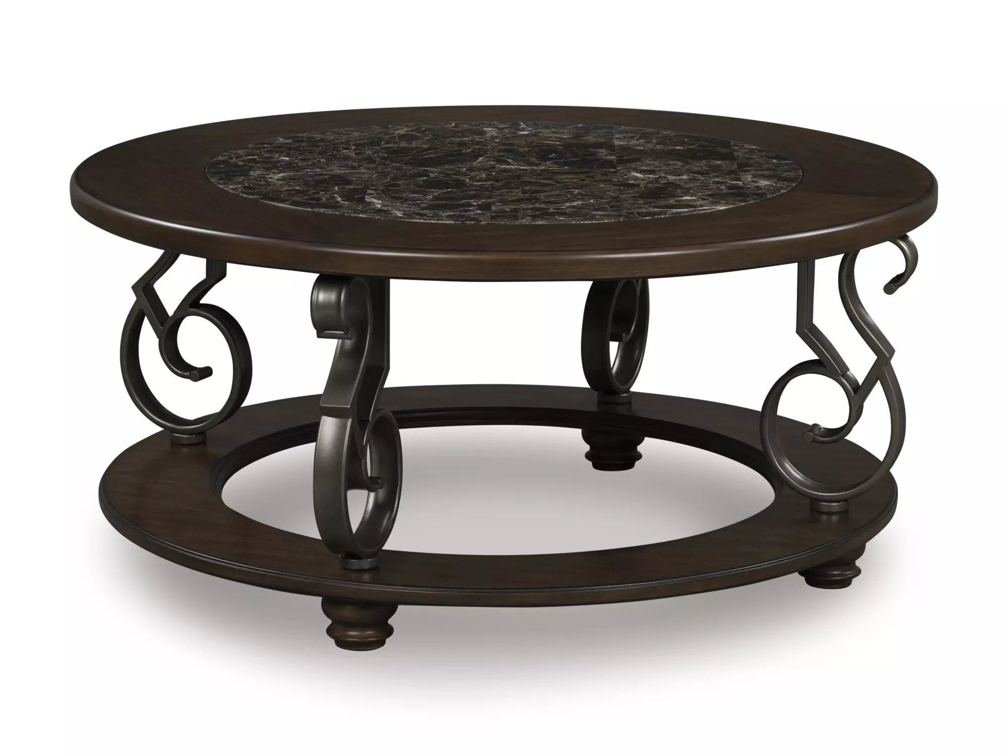 Product DetailsMade with birch veneer, decorative laminate and MDF substrate | Top with faux marble laminate and durable polyurethane topcoat | Warm brown finish | Metal legs with durable dark pewter-tone powder coat finish | Assembly required