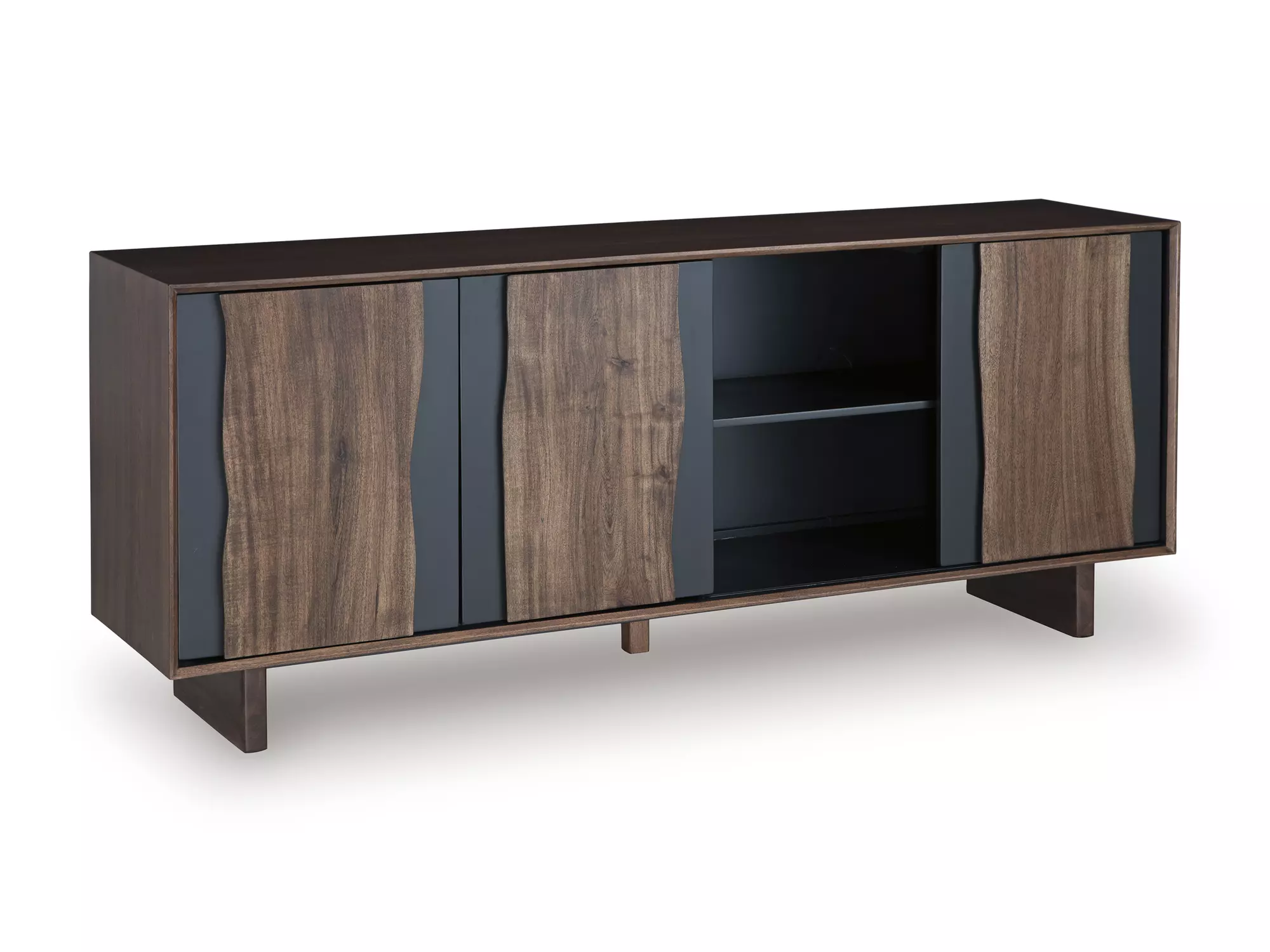 Product DetailsMade with acacia wood, acacia veneer and engineered wood | Medium brown and charcoal gray finishes | Hidden door pulls | Live edge door fronts | 2 doors with soft-close hinges | 1 sliding door | 2 fixed shelves | Openings in back for electronics | Due to the use of natural materials, some variations may occur | Minor assembly required; simply lay flat and attach feet