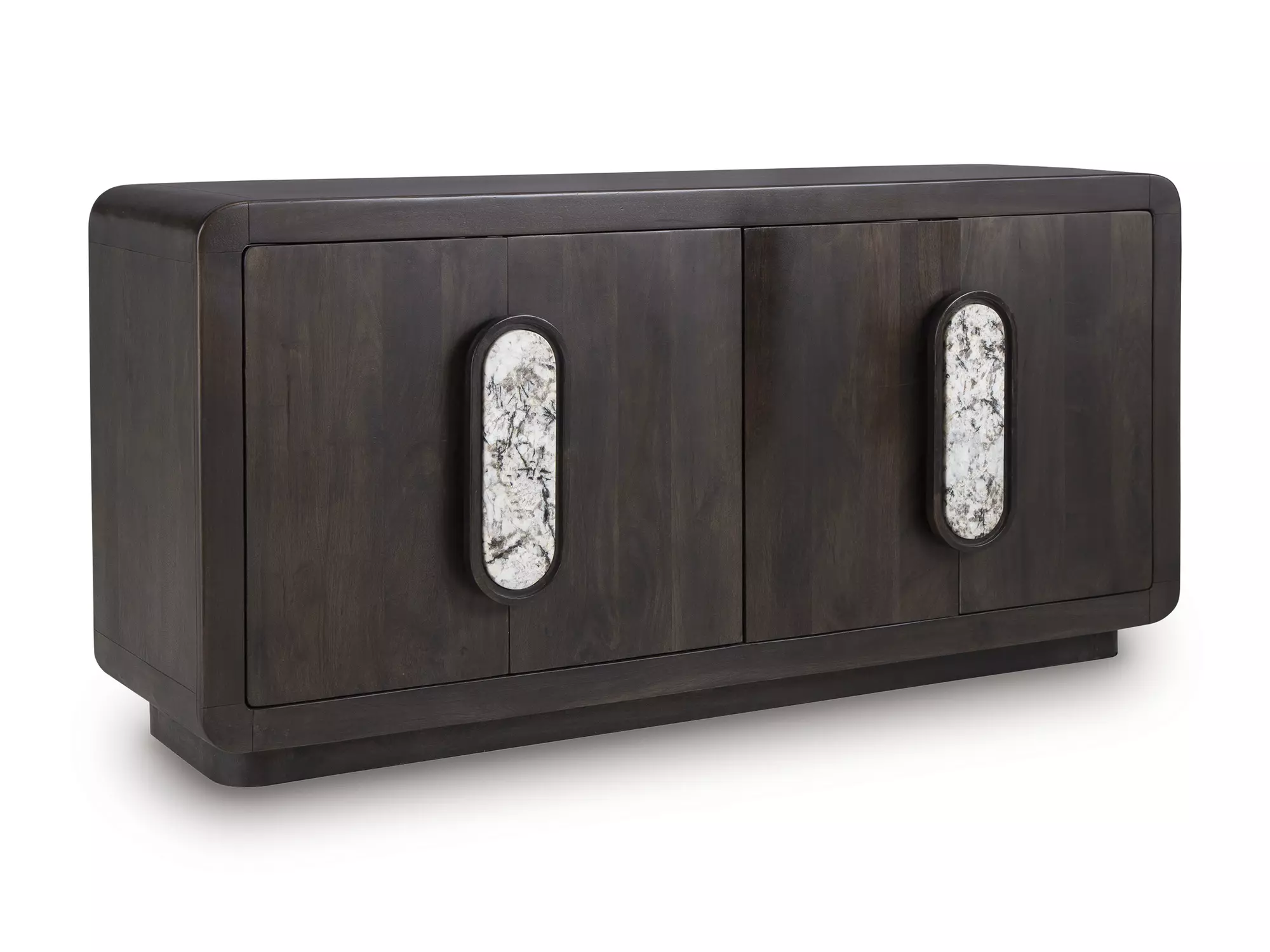 Product DetailsMade with solid mango wood | Back made with mango veneer and engineered wood substrate | Espresso brown finish | Oversized marble door pulls | 4 doors with soft-close hinges | 2 fixed shelves | Openings in back for electronics | Color variations, fissures, mineral deposits and veining in the marble pulls are naturally formed characteristics | Minor assembly required, simply attach door pulls