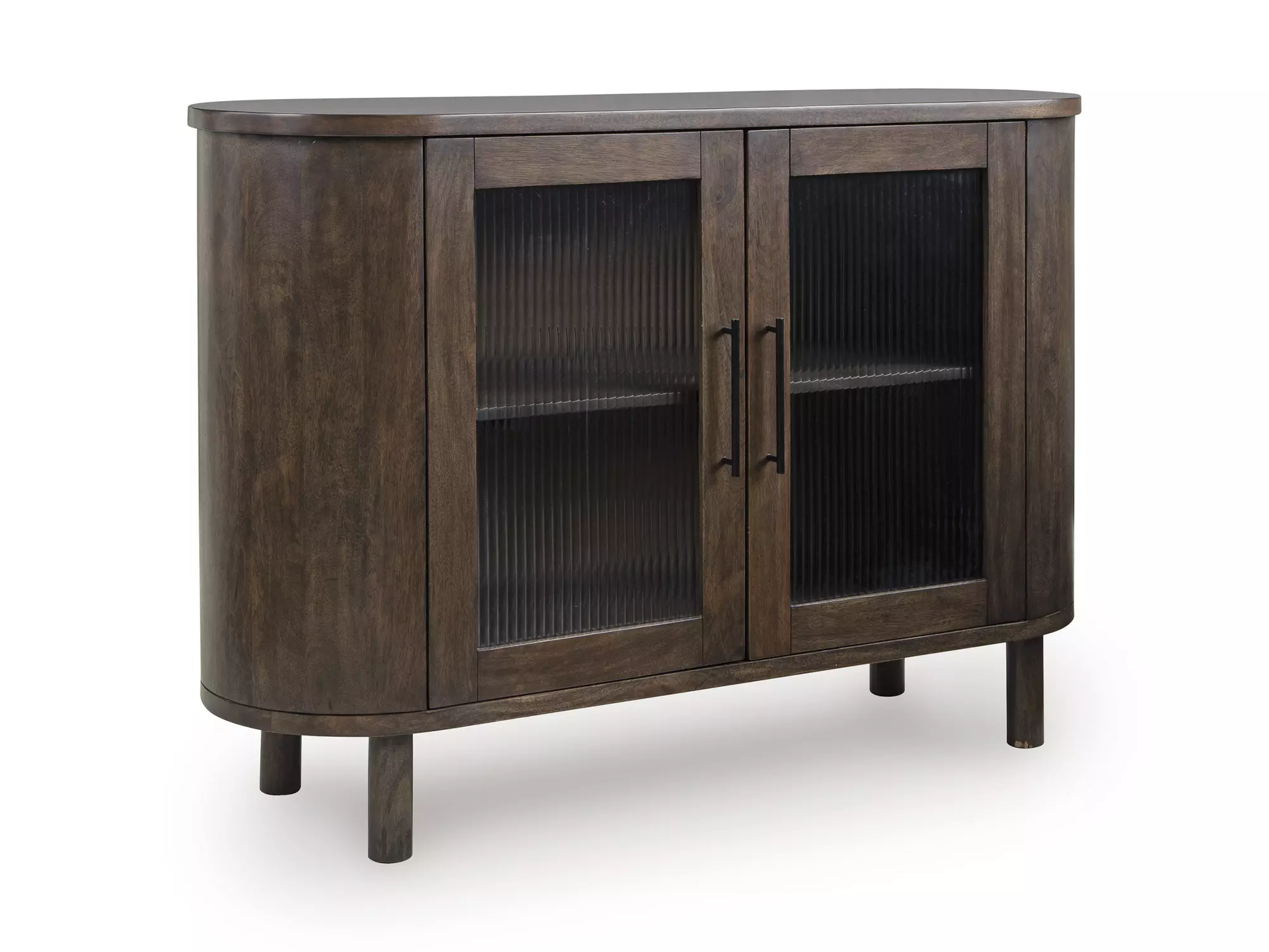 DescriptionA masterclass in casual design, this accent cabinet’s capsule shape strikes a superbly fluid pose. Behind wood-framed doors with fluted glass inserts and black metal door pulls, you’ll find a fixed shelf for simple and streamlined storage. Functional and fabulous, it's a welcome addition to your living area or entryway.