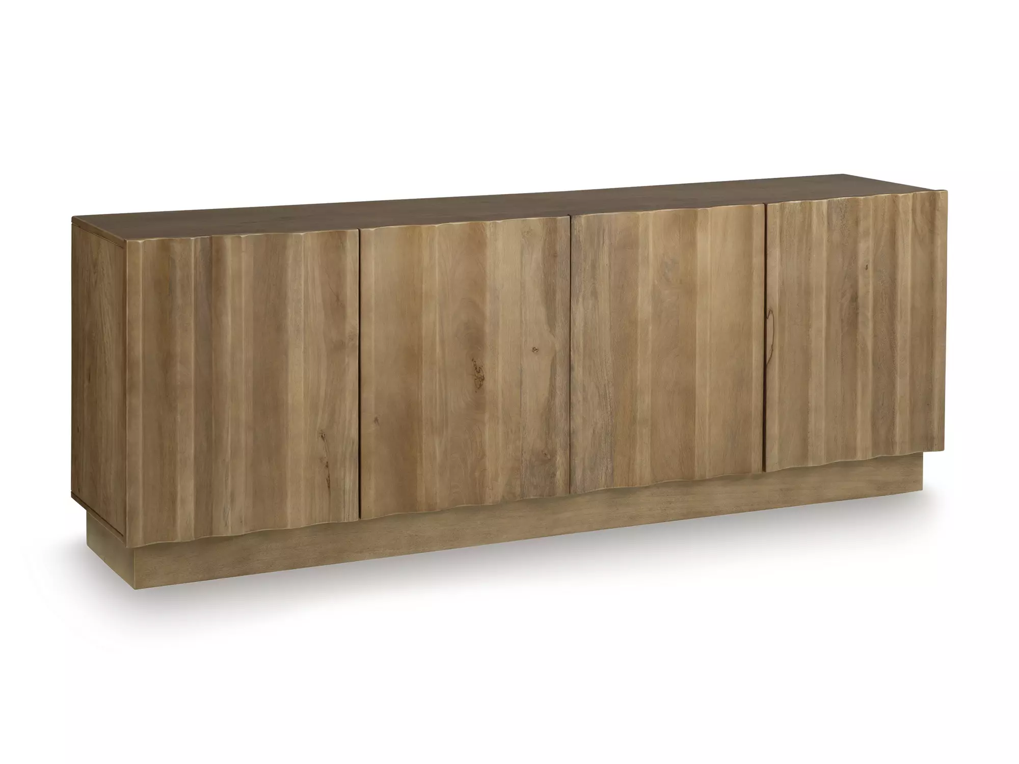 DescriptionDiscover the fabulous fusion of natural materials and masterful design in this accent cabinet. Its solid mango wood, in a natural light brown finish, creates a light, welcoming feel. Beyond the 4 carved, fluted doors, you’ll find two shelves perfect for tucking away everything from dinnerware to your media collection.