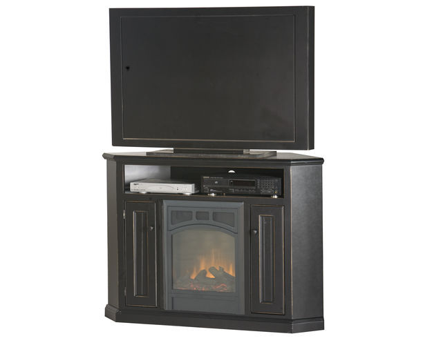 Description: 50 CORNER ENTERTAINMENT CONSOLE WITH FIREPLACE, (CORNER OUT 35 1 2), OPEN STORAGE ABOVE FIREPLACE, 2 BEAD BOARD DOORS, 2 FIXED WOOD SHELVES, PLAIN BASE*GLASS*NG*FINSISH*BK, CC, CO, CM, CR, EC, GO, HG, IV, SW, UN, WH