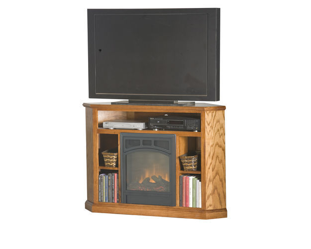 Description: 50 CORNER ENTERTAINMENT CONSOLE WITH FIREPLACE, (CORNER OUT 35 1 2), OPEN STORAGE ABOVE FIREPLACE, 2 FIXED SHELVES FOR SIDE STORAGE, PLAIN BASE*GLASS*NG*FINSISH*CC, DK, LT, MD, SO, UN, CR, CM