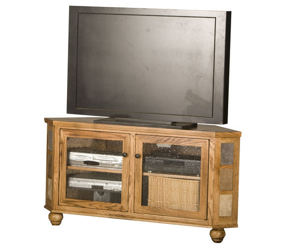 Description: 45 CORNER ENTERTAINMENT CONSOLE, (CORNER OUT 32), 2 GLASS DOORS, 1 FIXED WOOD SHELF, TILE ACCENTS, BUN FOOT BASE*GLASS*PL, SD*FINSISH*CC, DK, LT, MD, SO, UN, CR, CM