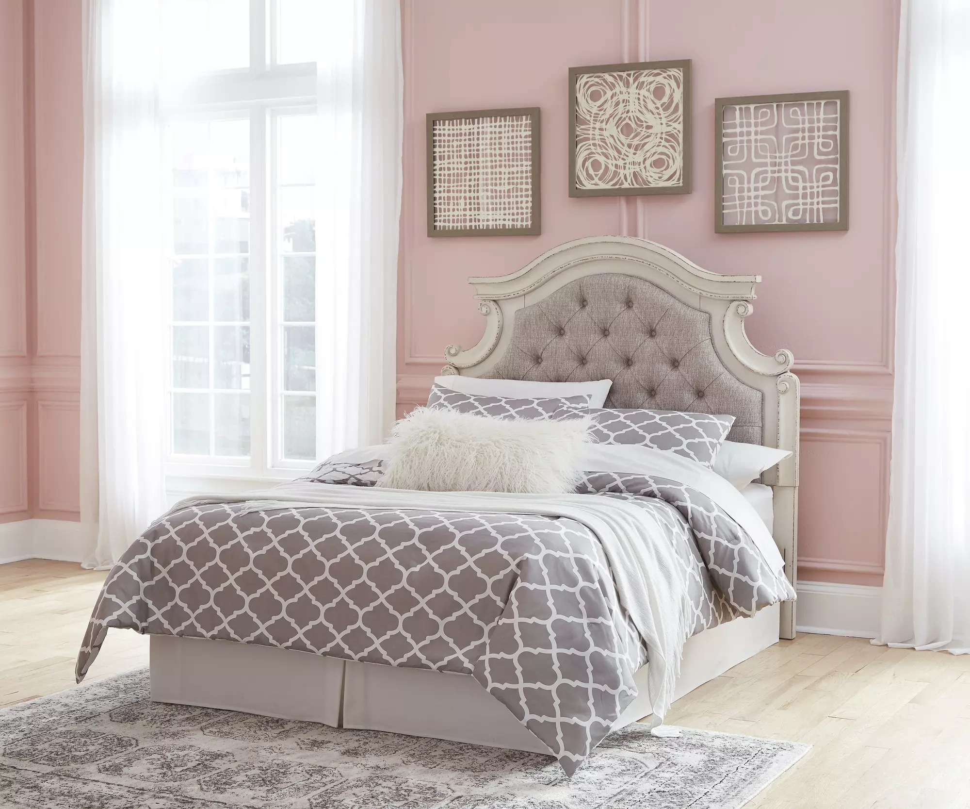 Redefining the art of traditional cottage styling, this full upholstered panel headboard is your dream bedroom retreat realized. The ornately shaped headboard with inset upholstered cushion brings cozy charm. Button tufting adds refinement, while a chipped white finish lends a classic touch.