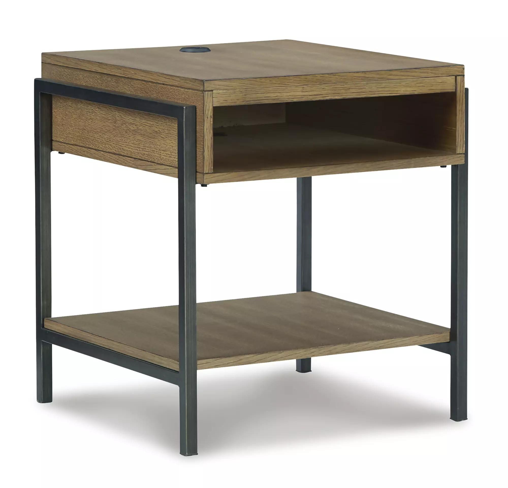 DescriptionBeautiful to behold, this urban contemporary end table is loaded with high style and convenience. The wood sports a light, natural-looking finish that provides a dramatic contrast to the black metal frame. Its open cubby is perfect for stowing away books and magazines. A cleverly placed AC/USB charging port on the top lets you power up without moving a muscle.