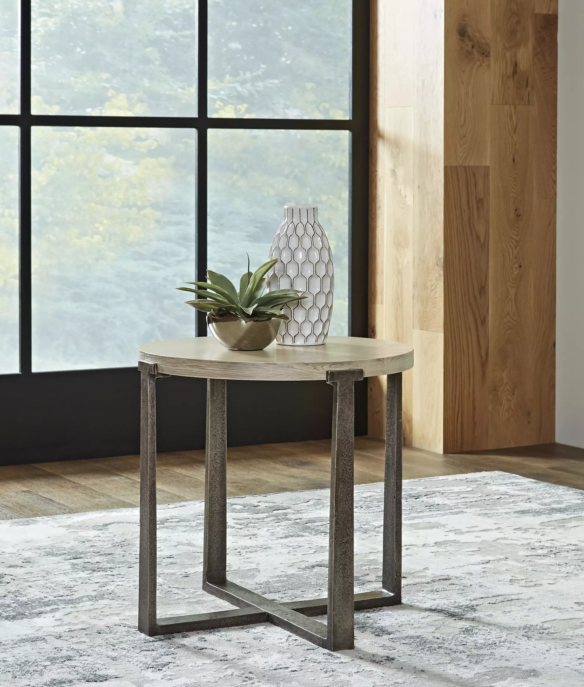 Product DetailsMade of oak veneer and engineered wood | Tabletop with warm gray finish | Distressed sand-casted aluminum base with antiqued pewter-tone finish | Assembly required