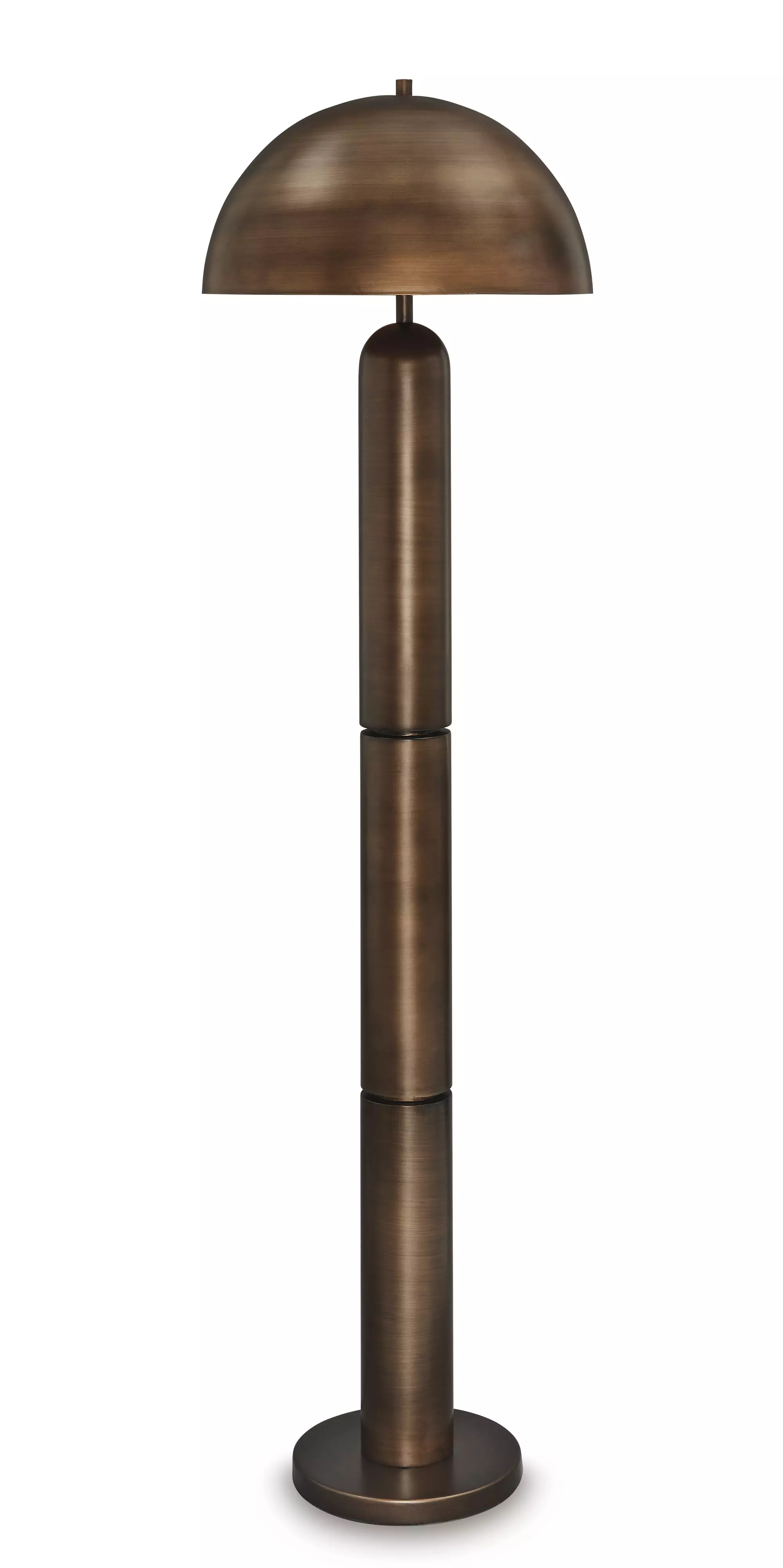 Dome sweet dome. Shine a light on your love of all things contemporary with this striking floor lamp. Its sleek antiqued copper-tone finish and bold, columnar design add a brilliantly modern touch to any room. A dome-shaped shade provides a warm and focused light, perfect for reading or creating a cozy ambiance. The matching table lamp (sold separately) is also a bright idea.