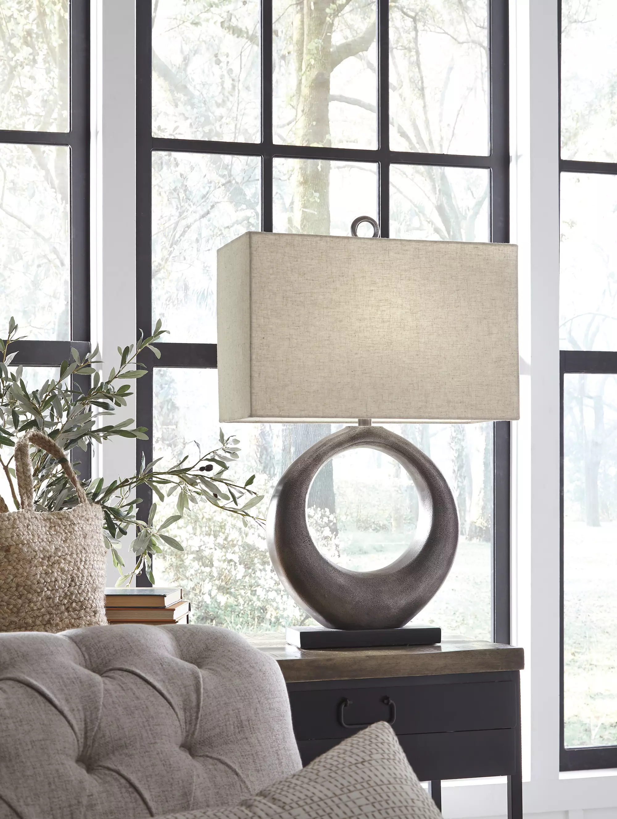 DescriptionPart sculpture and totally beautiful, this table lamp lets you delight in the art of lighting. The aesthetic may be contemporary and refined, but its antique silvertone cast aluminum infuses a raw element for beautiful balance.