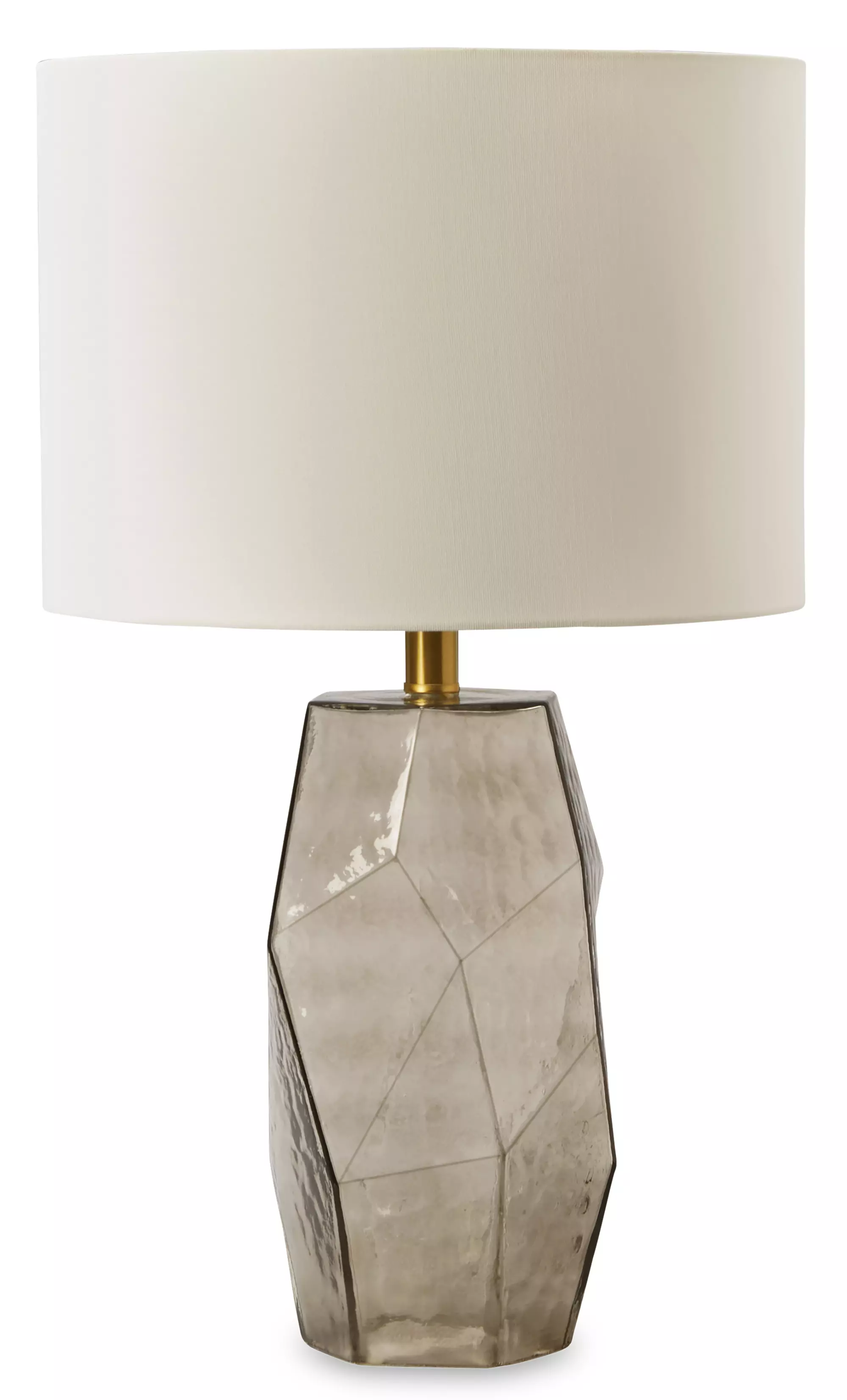 Product DetailsMade of glass with drum hardback fabric shade | Transparent gray finish | 3-way switch | 1 E26 socket, type A bulb recommended (not included); 100 watts max or LED equivalent; UL Listed | Assembly required