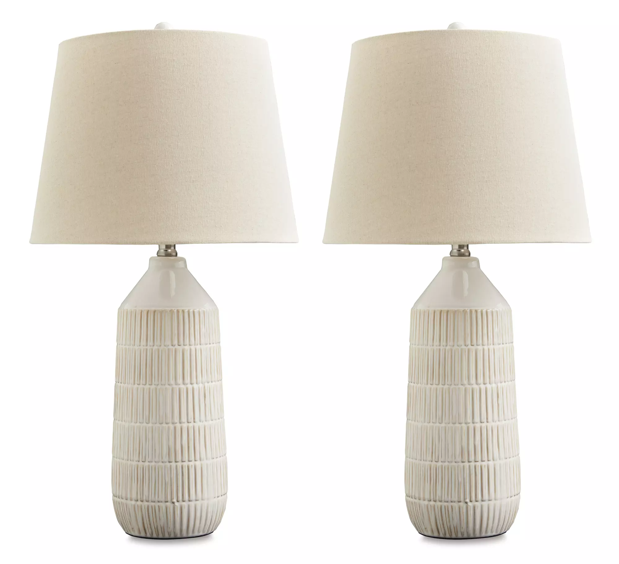 Product DetailsMade of ceramic with modified drum hardback fabric shade | Off-white finish with transparent glaze | 3-way switch | E26 socket, type A bulb (not included); 100 watts max or LED equivalent | UL Listed | Assembly required