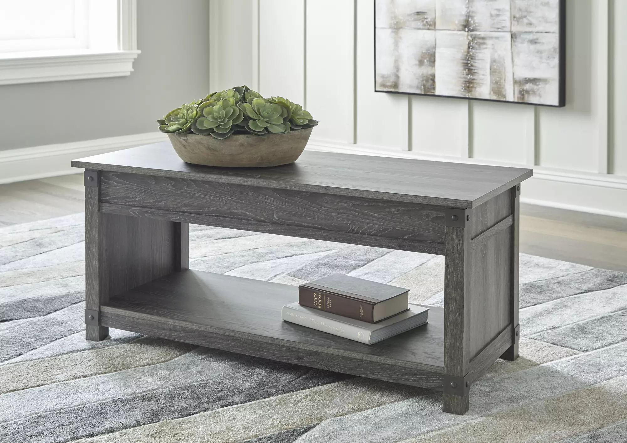 DescriptionOpen the door to modern farmhouse style with this lift-top coffee table. The beautiful woodgrain look and classic crossbuck metal accents are a cool touch, while the lower shelf provides surface space for fashionable home accessories. Sporting a gray replicated wood grain effect, its handy spring-loaded mechanism brings the tabletop closer to you. This versatile table makes it easier than ever to eat, work or play from the comfort of your sofa.