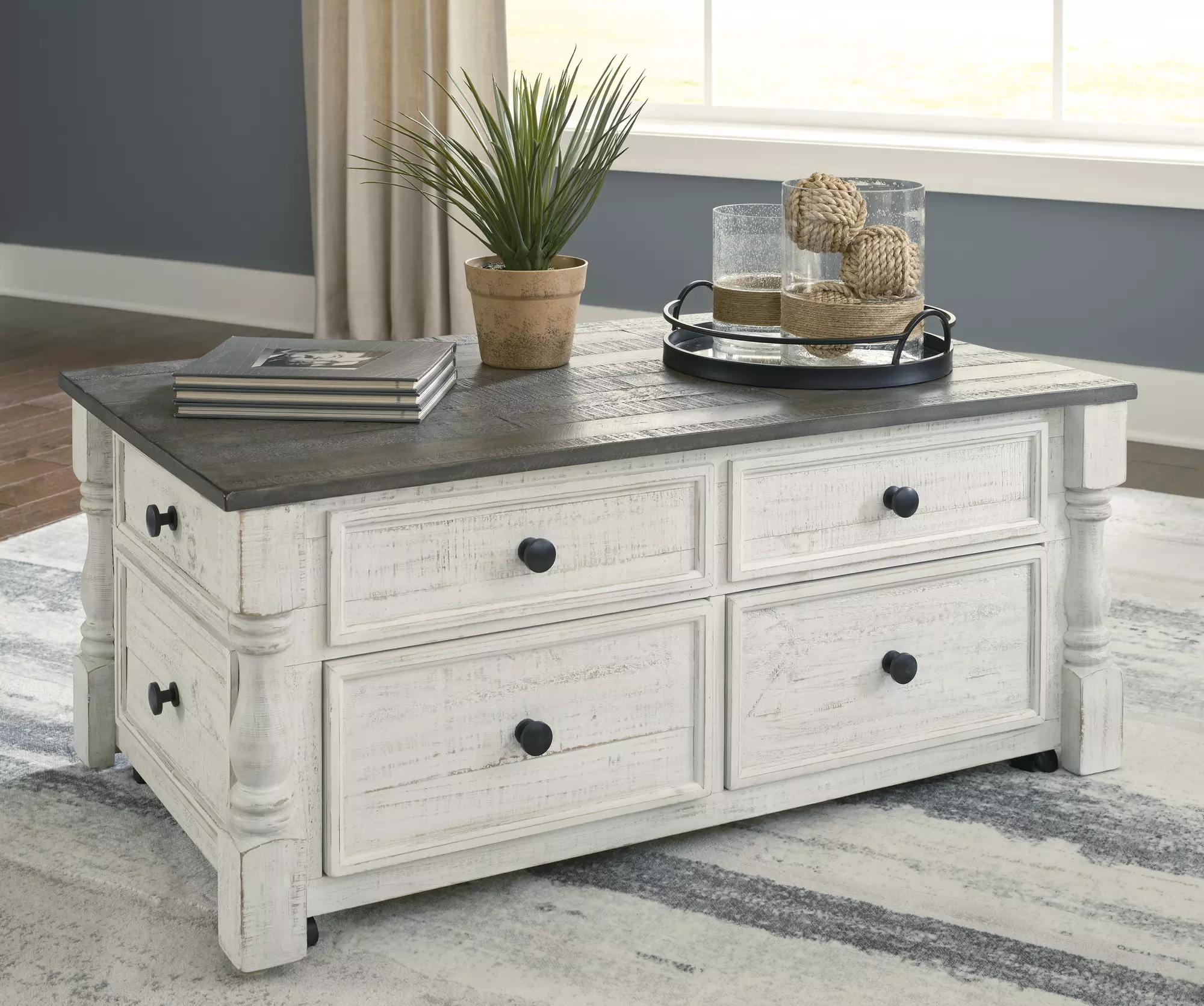 What a fresh interpretation of country classic style. Inspired by American farmhouse craftsmanship, but with an elevated sensibility, this lift-top coffee table blends distinctive details such as turned post accents and raised drawer fronts for a substantial look that feels right at home. Those who appreciate rustic character should take note of the table’s thick crown moulding, beautified with a vintage two-tone finish. It features four storage drawers, a small concealed storage tray under the lift-top, and robust legs that are ready to stand the test of time. And casters allow you to roll it wherever you like.