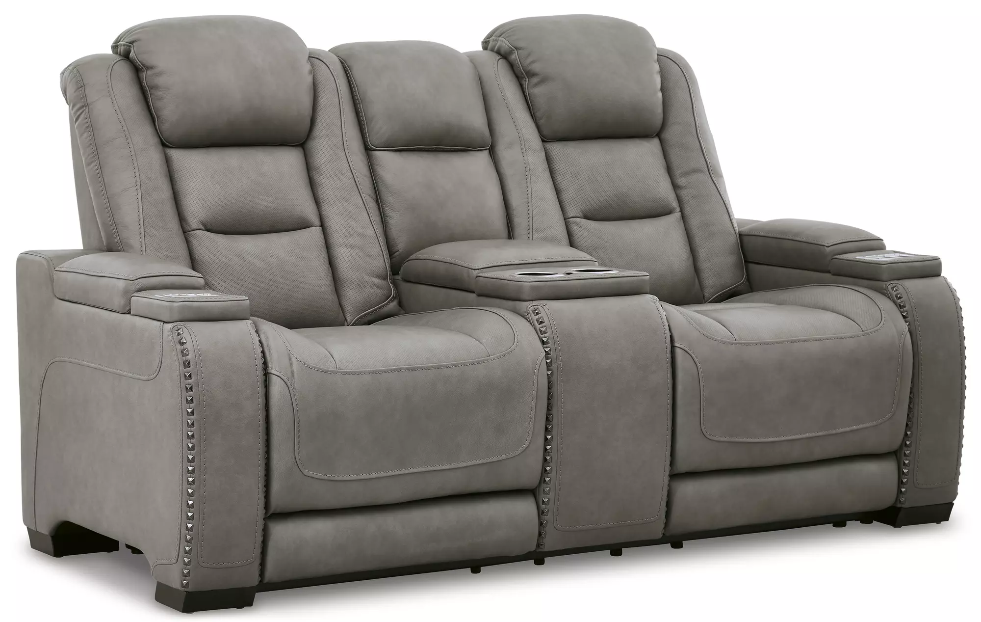 the man-den gray pwr rec loveseat/con/adj hdrst by ashley