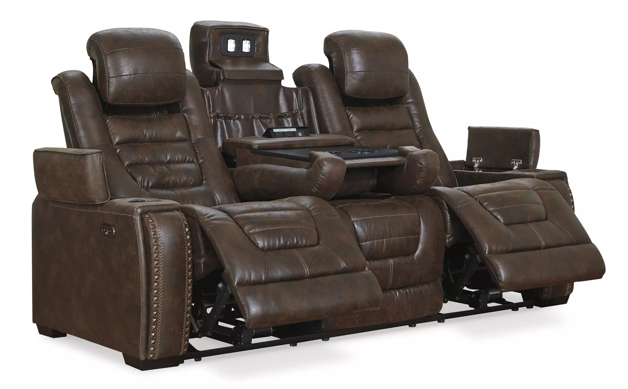 Product DetailsDual-sided recliner | Faux leather upholstery | Corner-blocked frame with metal reinforced seat | Attached back and seat cushions | High-resiliency foam cushions wrapped in thick poly fiber | One-touch power controls with adjustable positions | Includes USB charging port in each power control | Easy View™ power adjustable headrests | Cup holders; flip up padded armrests with hidden storage underneath | Drop down table with 2 cup holders and a handy docking station for charging electronics | Flip up LED light (under center seat headrest) | Nailhead trim | Power cord included; UL Listed
