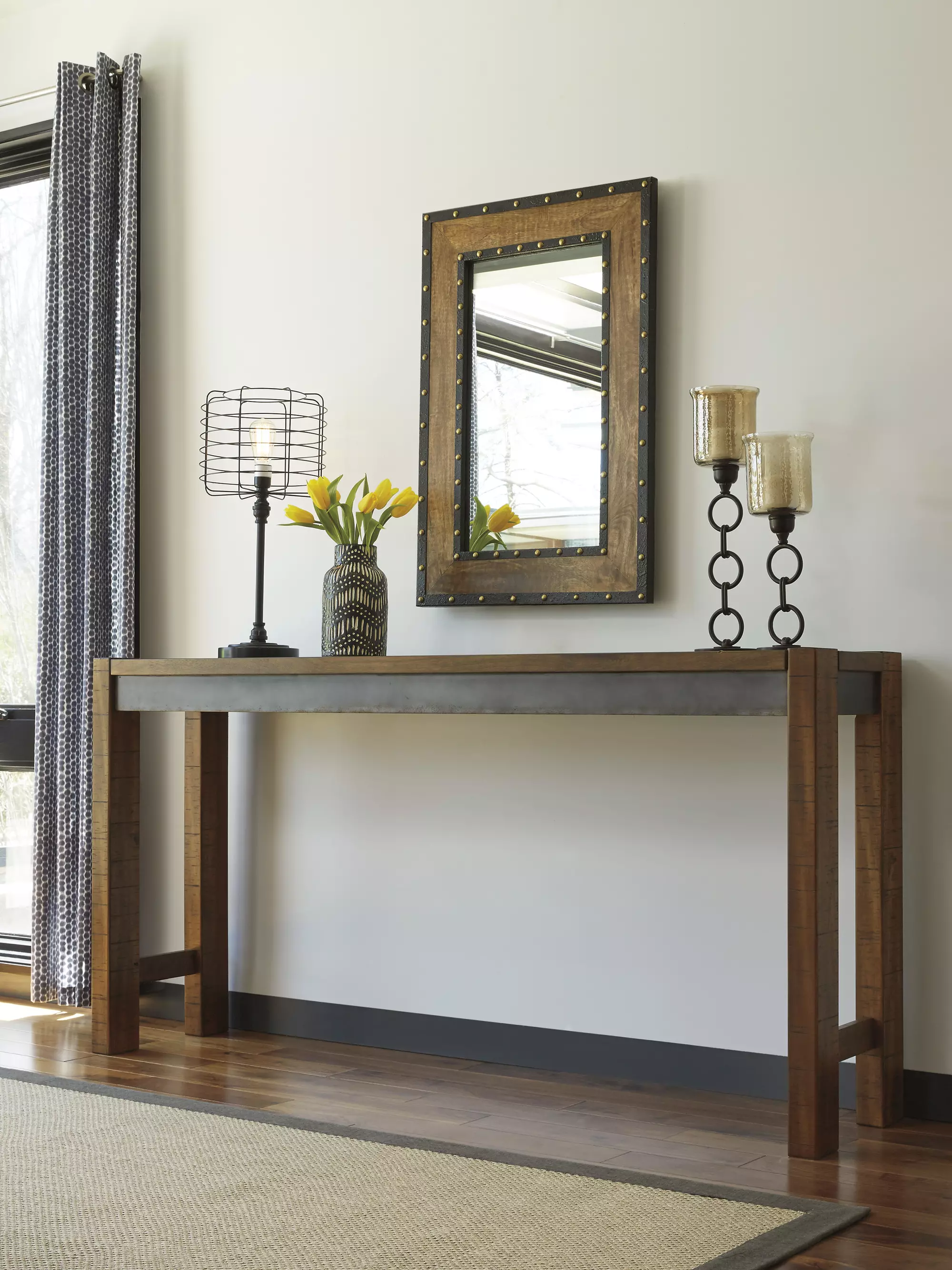 DescriptionMake your home the hub for cool vibes with this long counter table. Two-tone finish scheme of distressed warm brown and aged gunmetal is full of urban industrial swagger. Long length makes it suitable for 3 people to sit. Add it behind your sofa with stools for a dapper eating or working space.