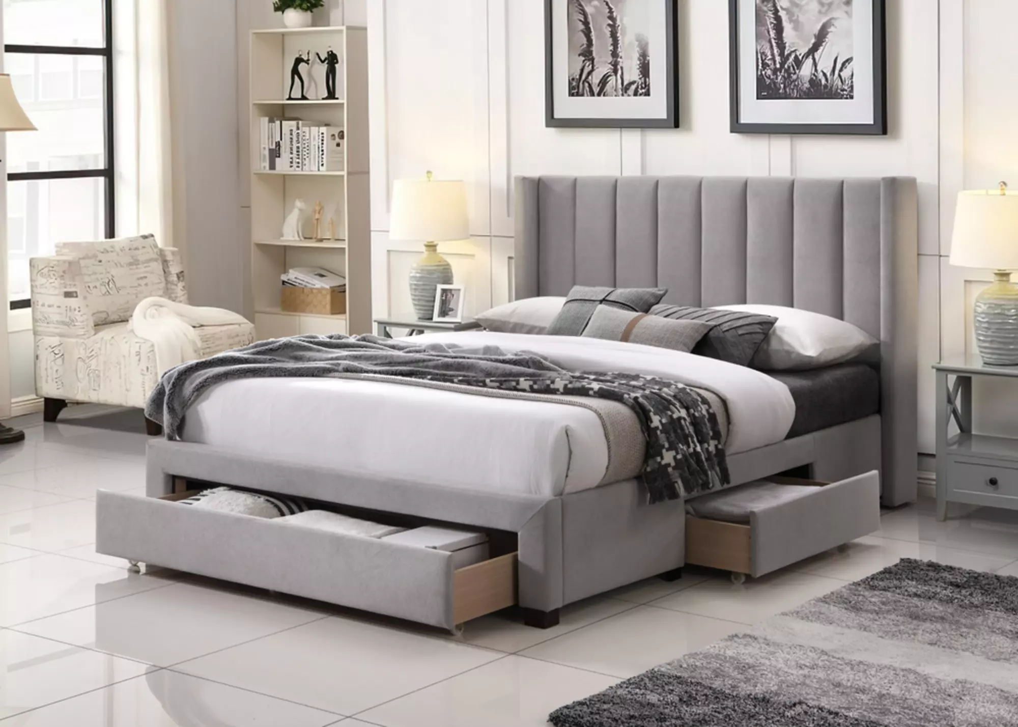 light grey queen upholstered storage bed (no box spring required) by exact (8950L|HB|LGREY)