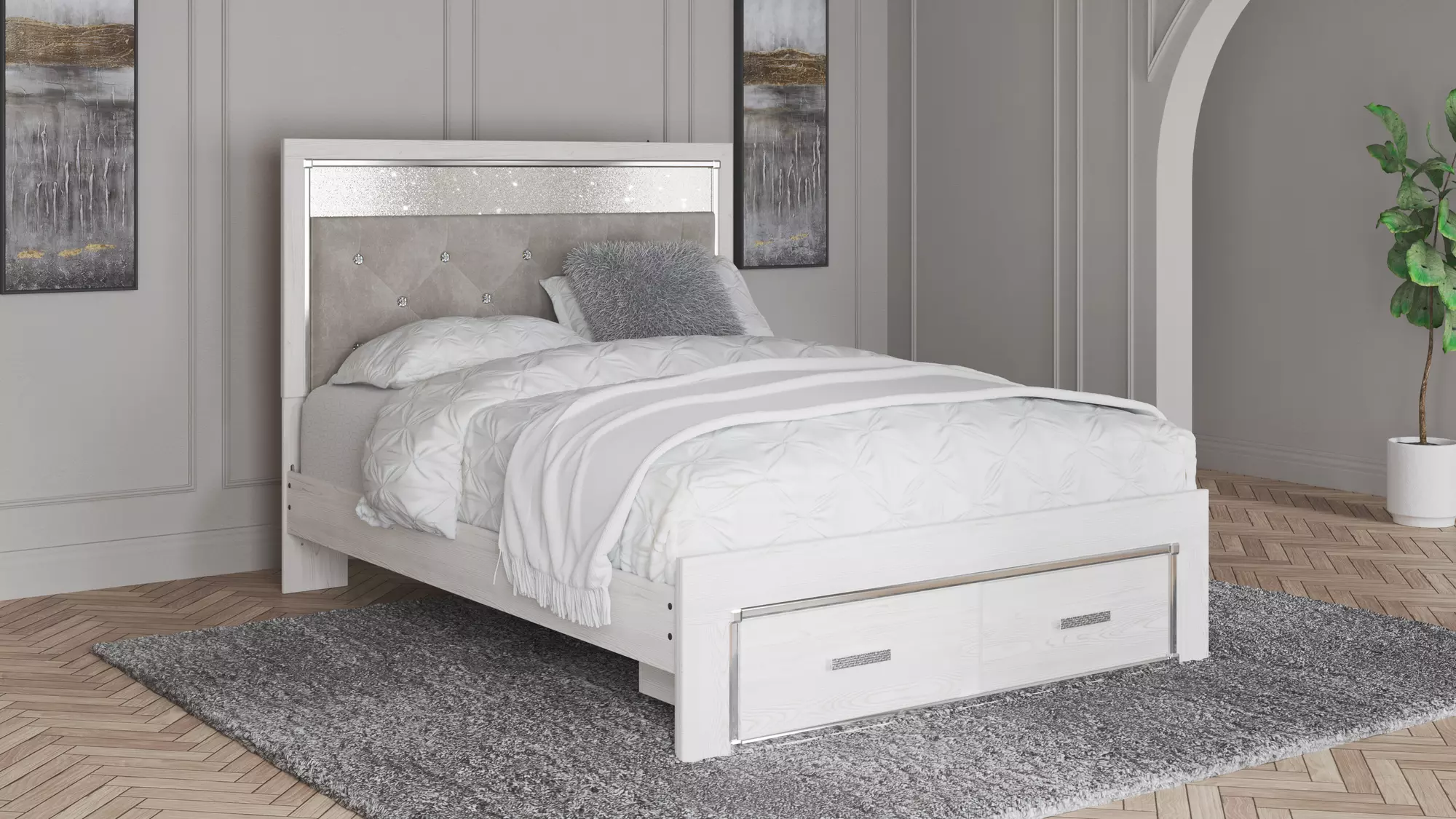DescriptionThis queen storage footboard is made with engineered wood (MDF/particleboard/plywood) and decorative laminate. Pairs with other items in the series to make a bed kit.