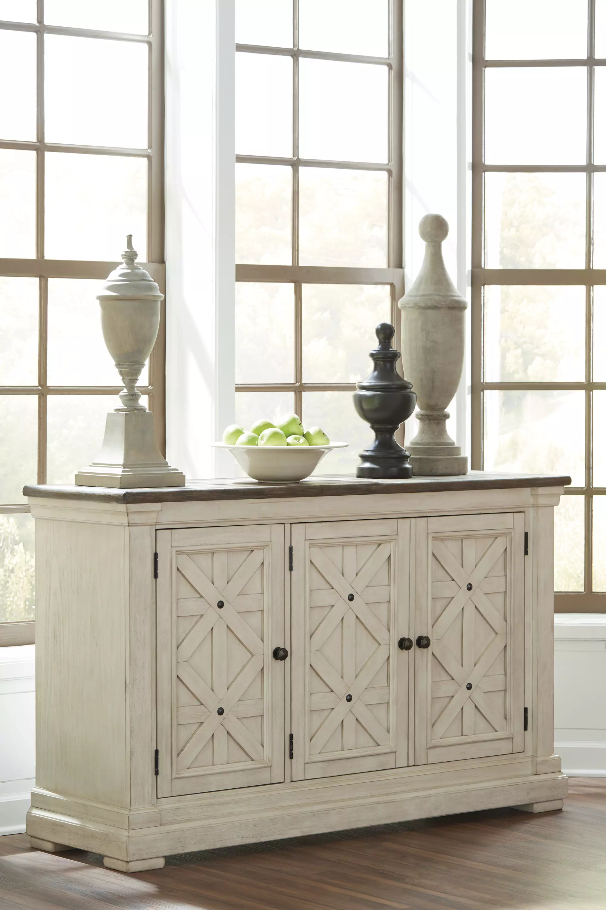 DescriptionNeed a stylish space to store dinnerware and all your dining room essentials? This server is a dream come true, with four adjustable shelves that offer large capacity and a spacious top that's perfect for setting a buffet. Embellished with the casual appeal of three latticed doors, an attractive planked top with a weathered oak finish and a lightly distressed white finish throughout, this vintage look will serve up elegance for years to come.