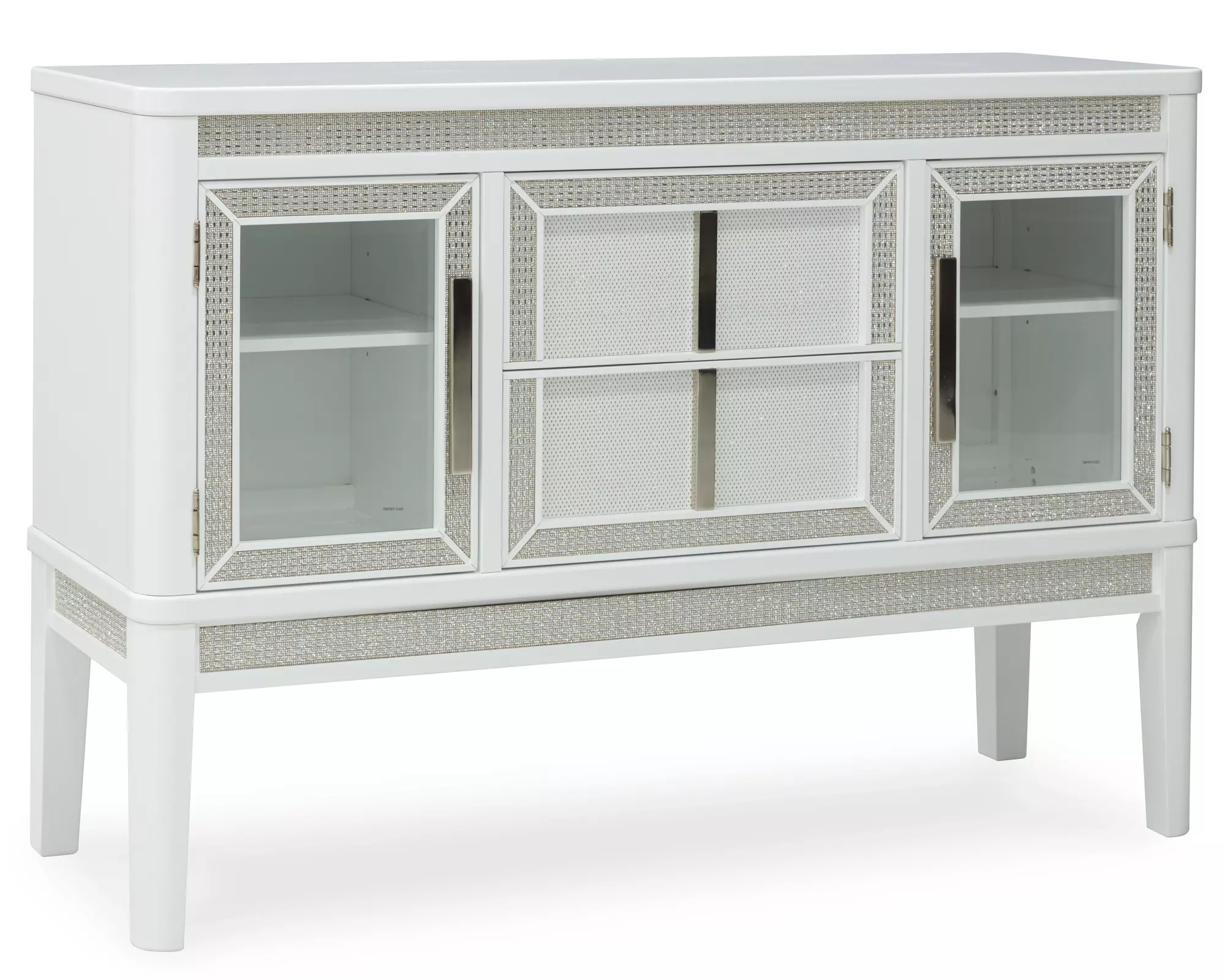 Embracing modern glamour, this server is a sparkling addition to your dining area. The bright white lacquer finish, shimmering rhinestone accents and glass panel doors give this piece plenty of polish. Discreetly placed along the upper valance, white LED lighting adds the perfect finishing touch.