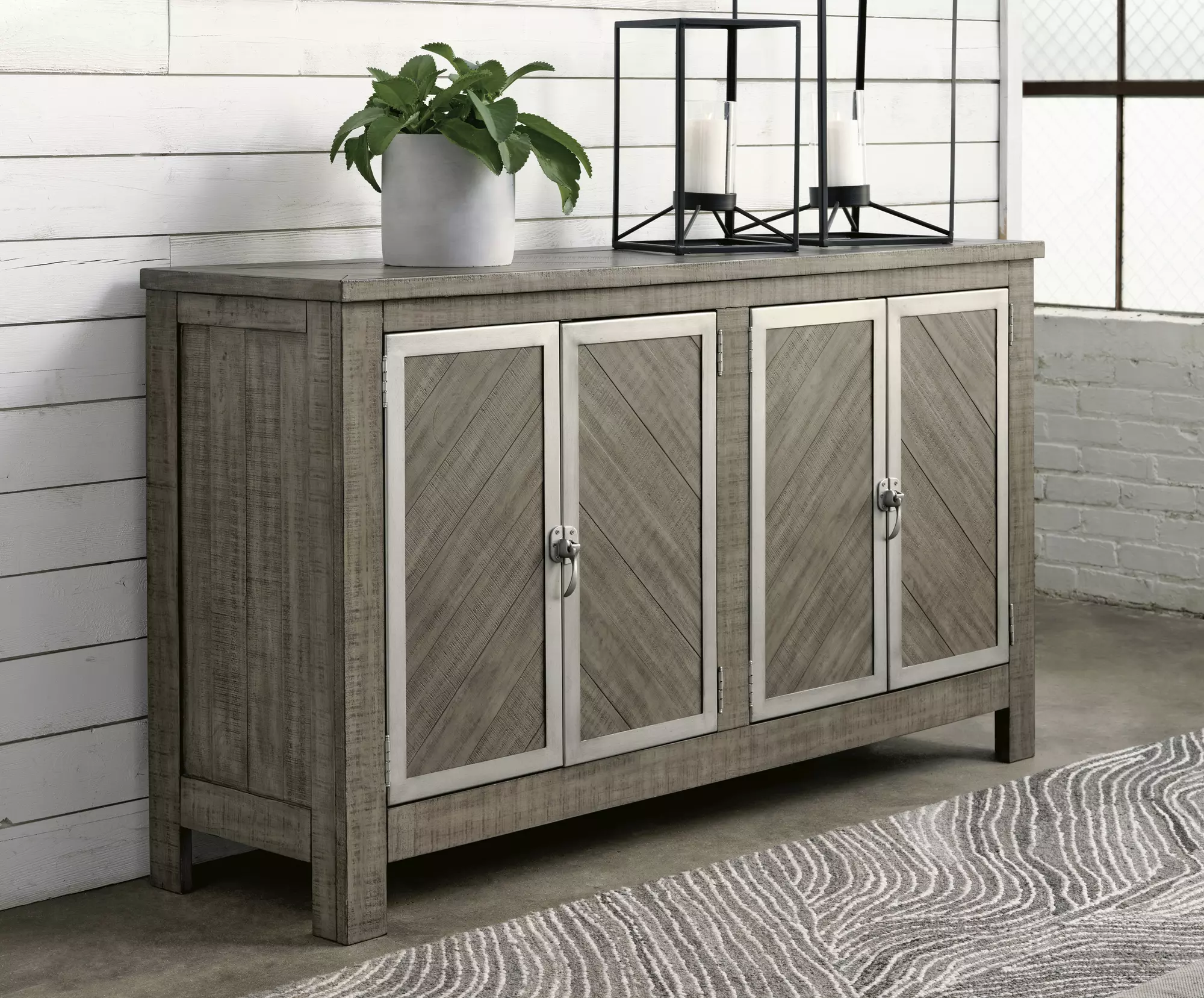 DescriptionThe use of mixed materials on this urban-inspired double buffet makes it a true statement piece. Made of wood with metal accents, this buffet features two spacious cabinets, each with an adjustable shelf and metal framed doors with trend-right window latches. A complex blend of stains and glaze create a weathered gray finish for a relaxed and harmonious update to your home.