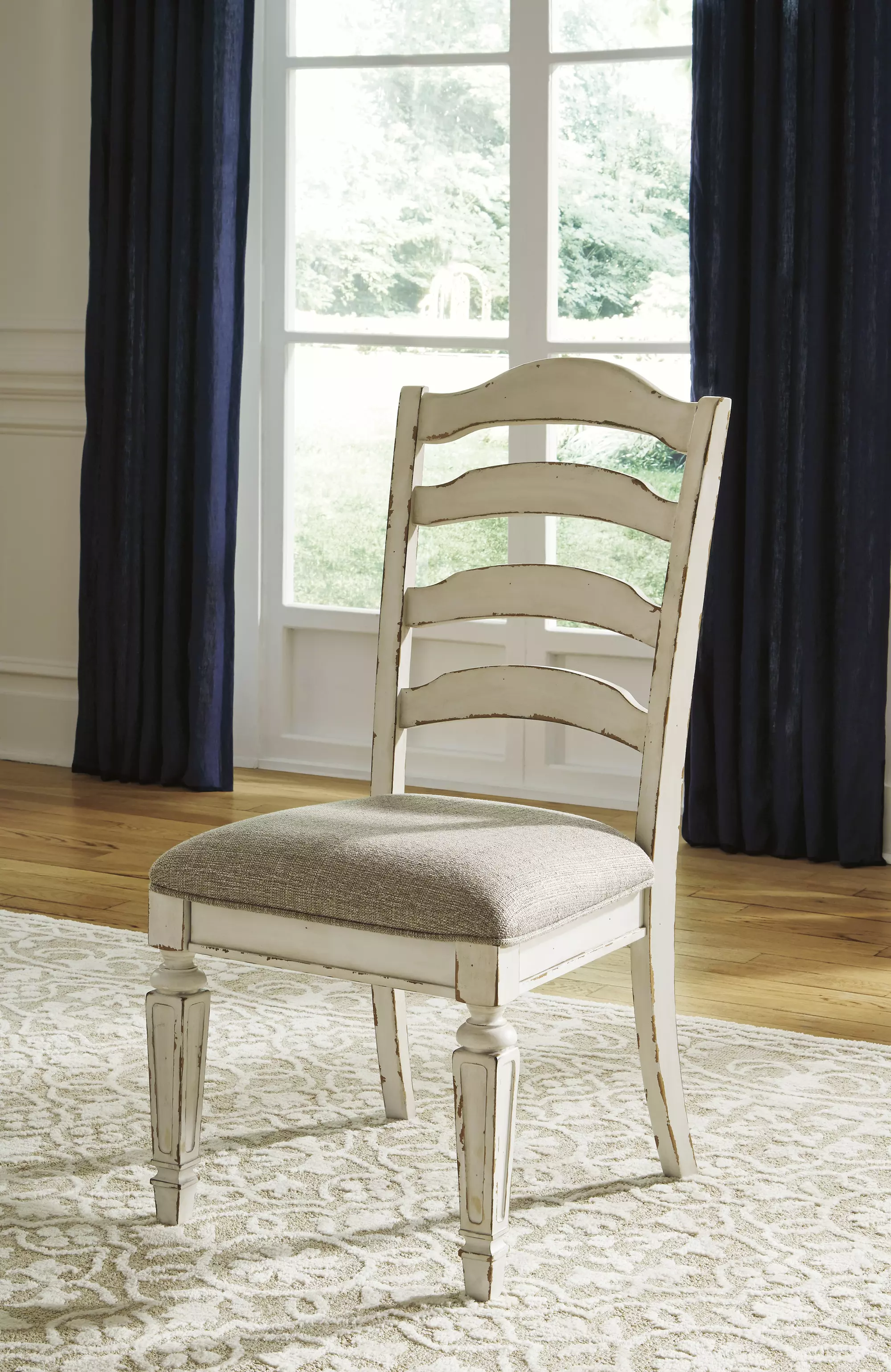 DescriptionBon appétit. With its rounded ladderback styling, chipped white finish and plushly cushioned seat, the Realyn dining room chair has all the right ingredients for a French country-inspired feast for the eyes.