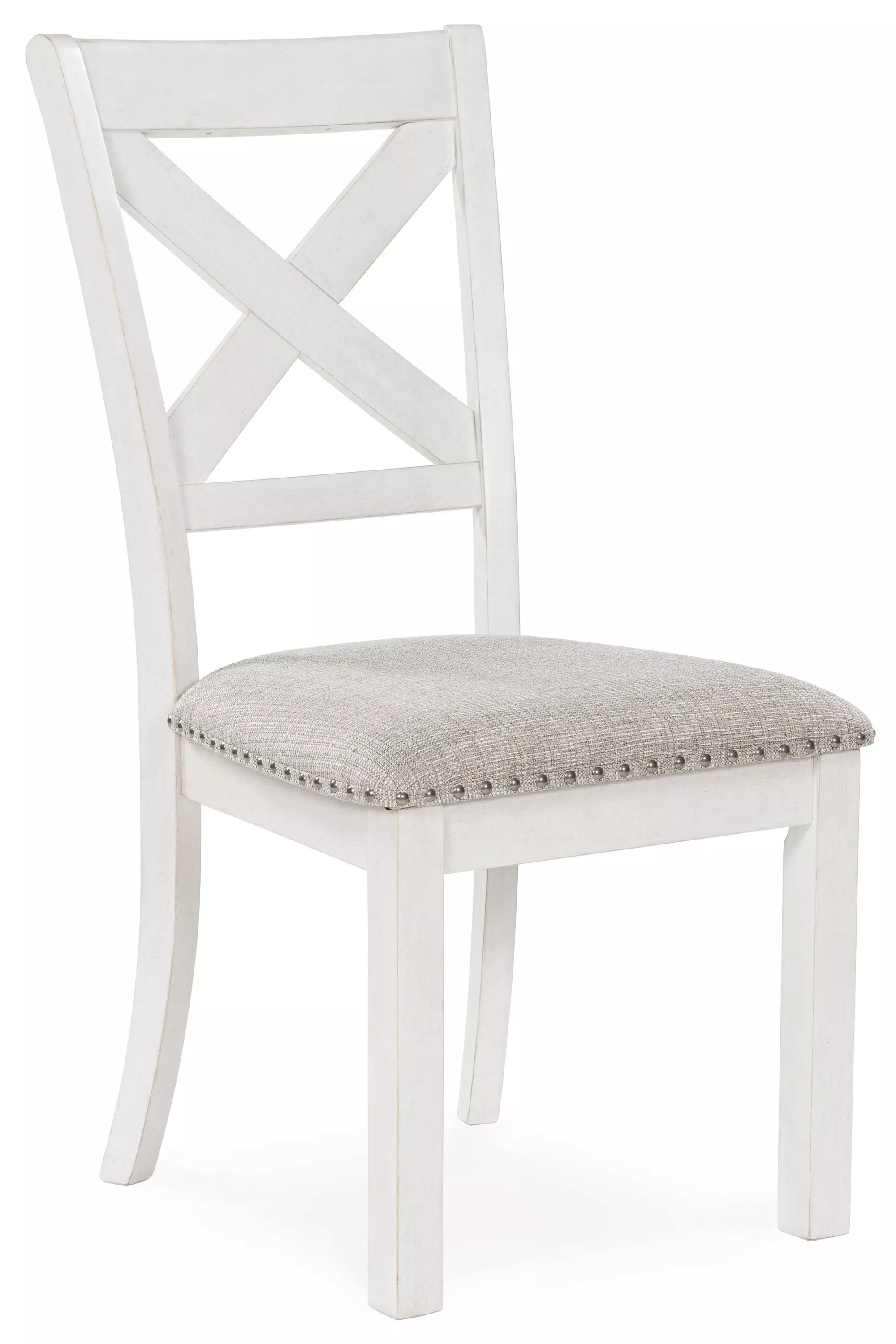 This dining chair is sure to impress come mealtime. With its antiqued white finish, classic country X-back and light gray upholstery with nailhead trim, modern farmhouse-style dining has never been so fashionable. All that's missing is you and your family.