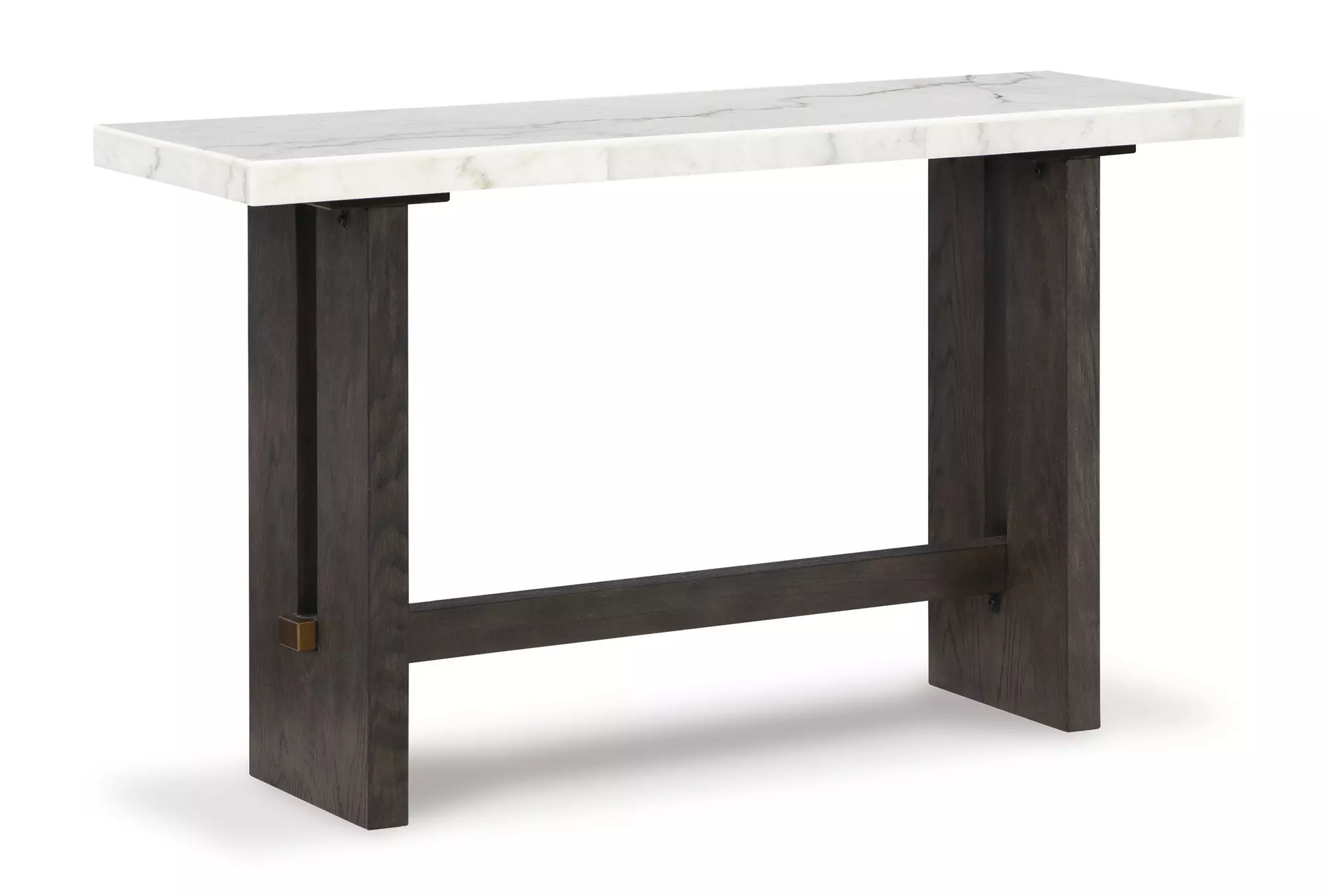 DescriptionDressed to thrill, this simply stunning sofa table offers a high-design look at a down-to-earth price. Ultra-sleek lines are accentuated with a dark waxy brown oak finish that’s so easy on the eyes. Clean-lined and modern, the plinth base and natural marble tabletop showcase quality craftsmanship and attention to detail. This table is the perfect sofa companion for a living room or family space, with a timeless look that's made to last.