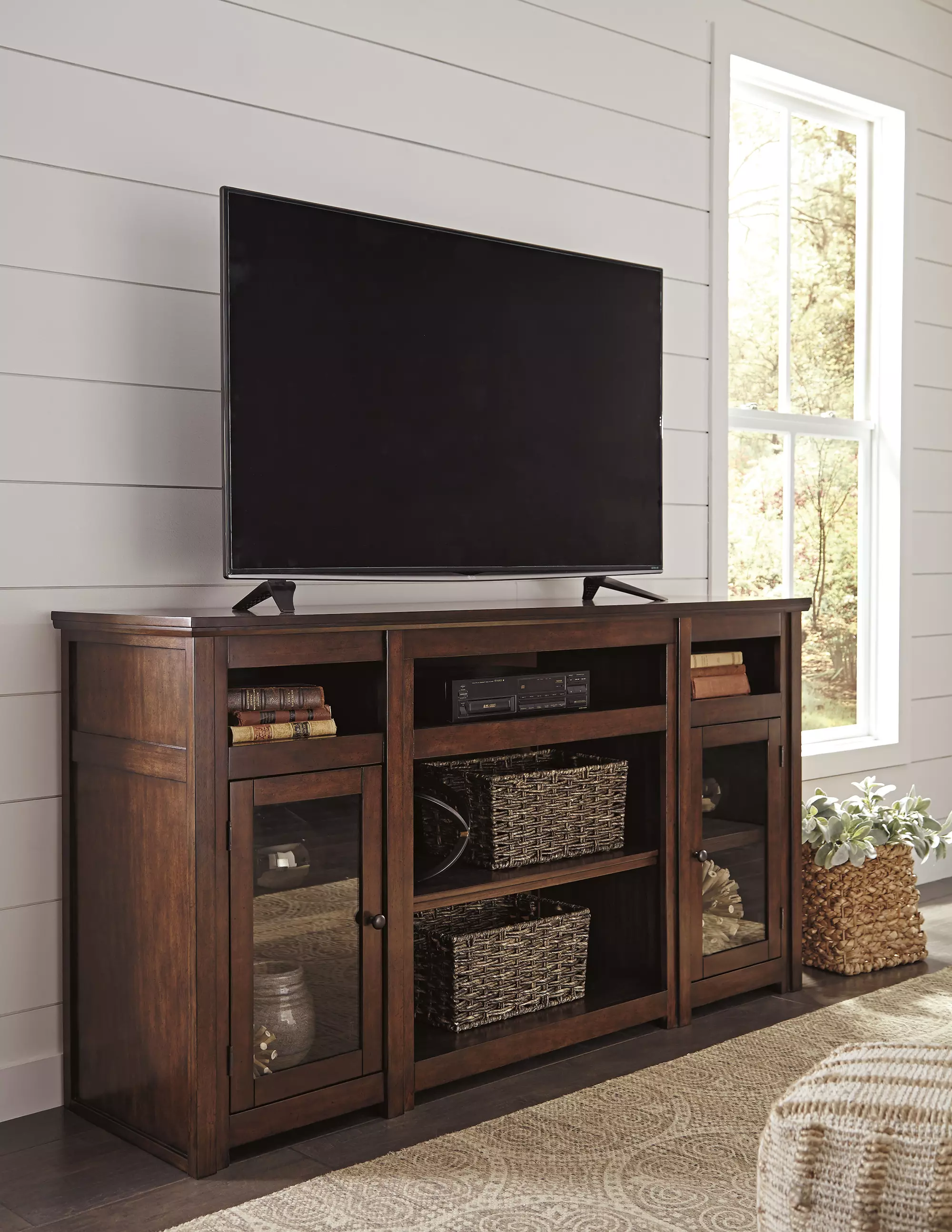 harpan reddish brown xl tv stand w/fireplace option by ashley