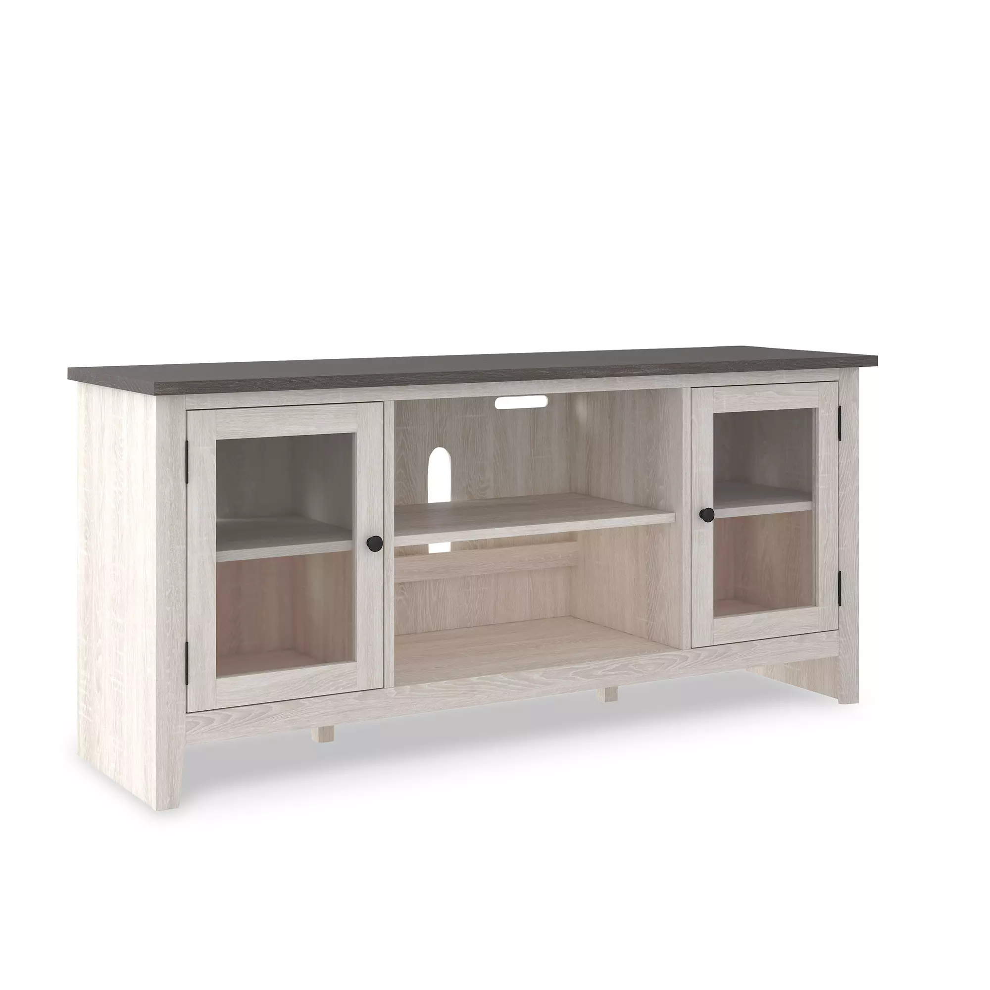 DescriptionWith its two-tone finish and minimalist charm, this TV stand with fireplace option is right in tune with your relaxed approach to high style. Beautifully made to accommodate your media equipment, it’s well equipped with adjustable shelving, cutouts for wire management and a pair of glass-front doors that enhance the clean-lined aesthetic. The look is ideal for modern farmhouse and contemporary settings.