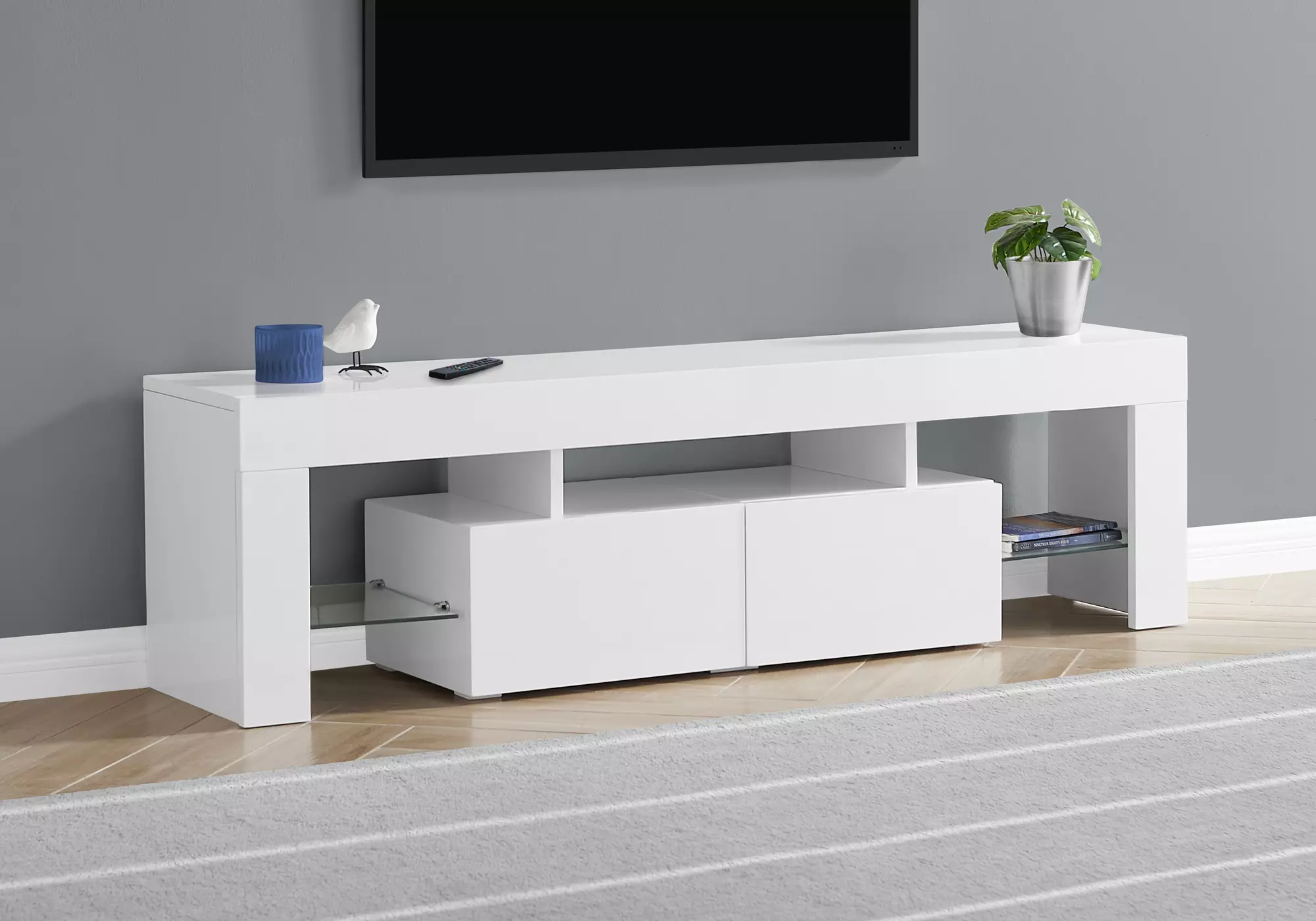 tv stand - 63 l - high glossy white with tempered glass by monarch specialties (I3548)