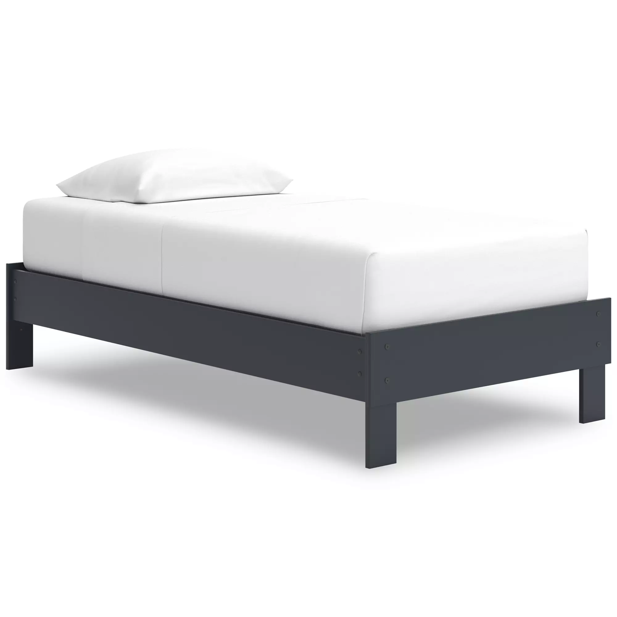 Product DetailsTwin platform bed includes footboard, rails and platform (does not include headboard) | Made with engineered wood (MDF/particleboard/plywood) and decorative laminate for the right balance of affordability and durability | Matte navy blue finish | Decorative laminate replicates natural or man-made material surfaces with consistent color, pattern and texture | Bed does not require additional foundation/box spring; accommodates most zero clearance adjustable bases | Mattress available, sold separately | Assembly required