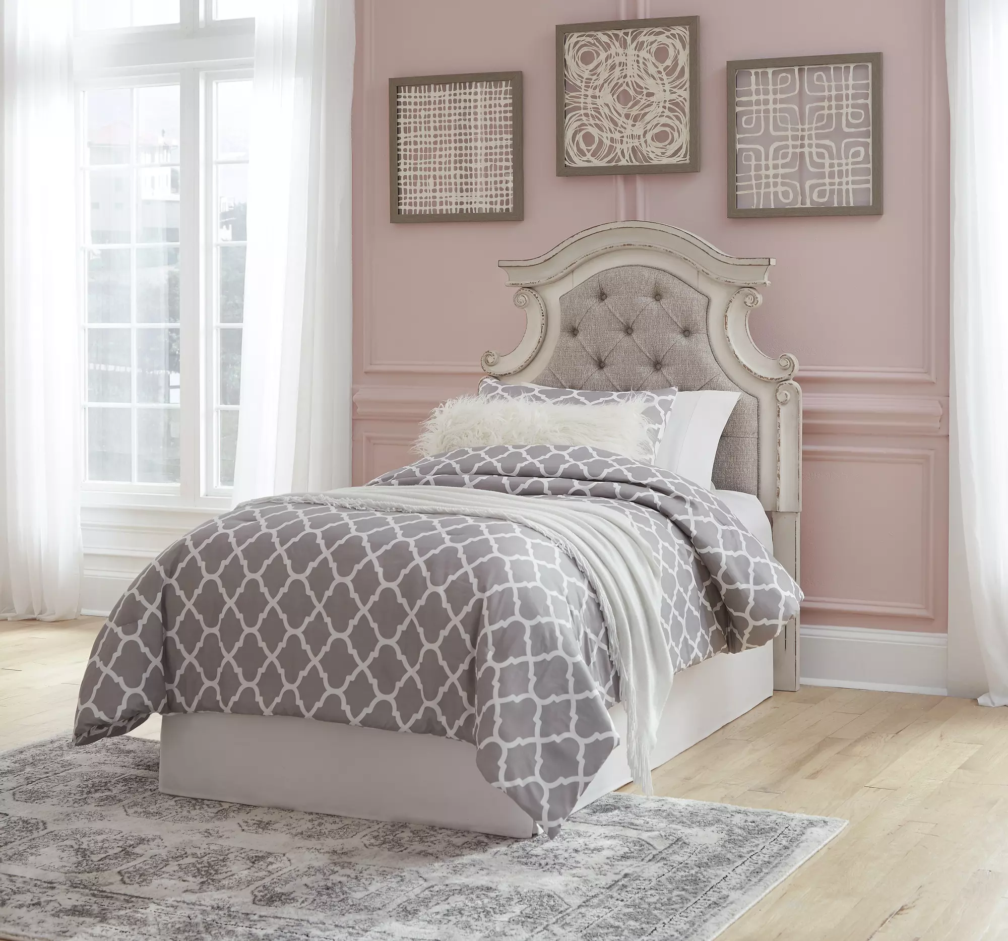 Redefining the art of traditional cottage styling, this twin upholstered panel headboard is your dream bedroom retreat realized. The ornately shaped headboard with inset upholstered cushion brings cozy charm. Button tufting adds refinement, while a chipped white finish lends a classic touch.