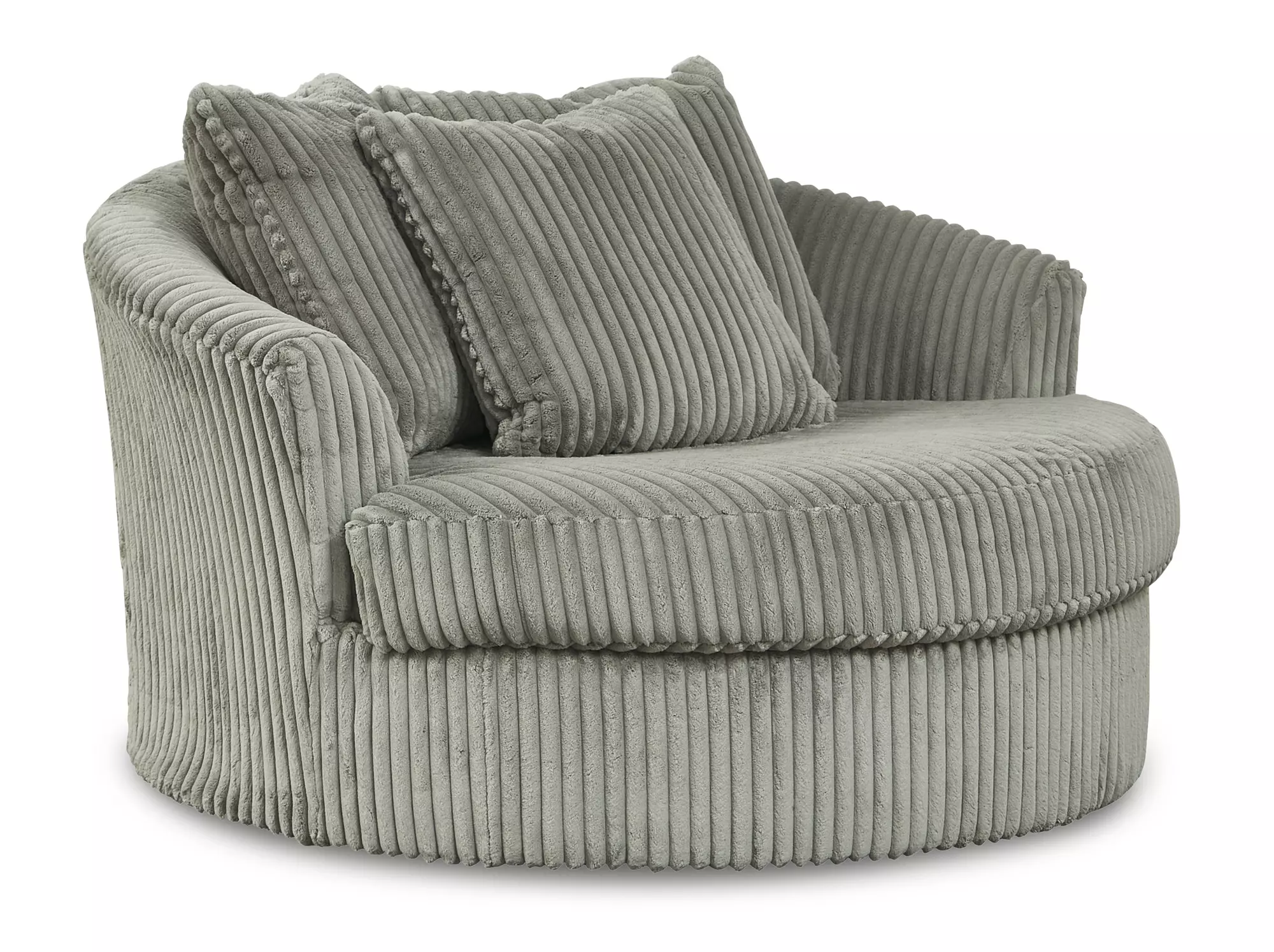 DescriptionPlush and posh. Showcase your eye for on-trend texture with the statement-making cord upholstery of this oversized swivel accent chair. Its stunningly soft fabric entices in a warm neutral hue, complementing contemporary color palettes. Sink into the spacious cushion and plan to stay a while—this cozy living room chair highlights your high-end approach to comfort and style.