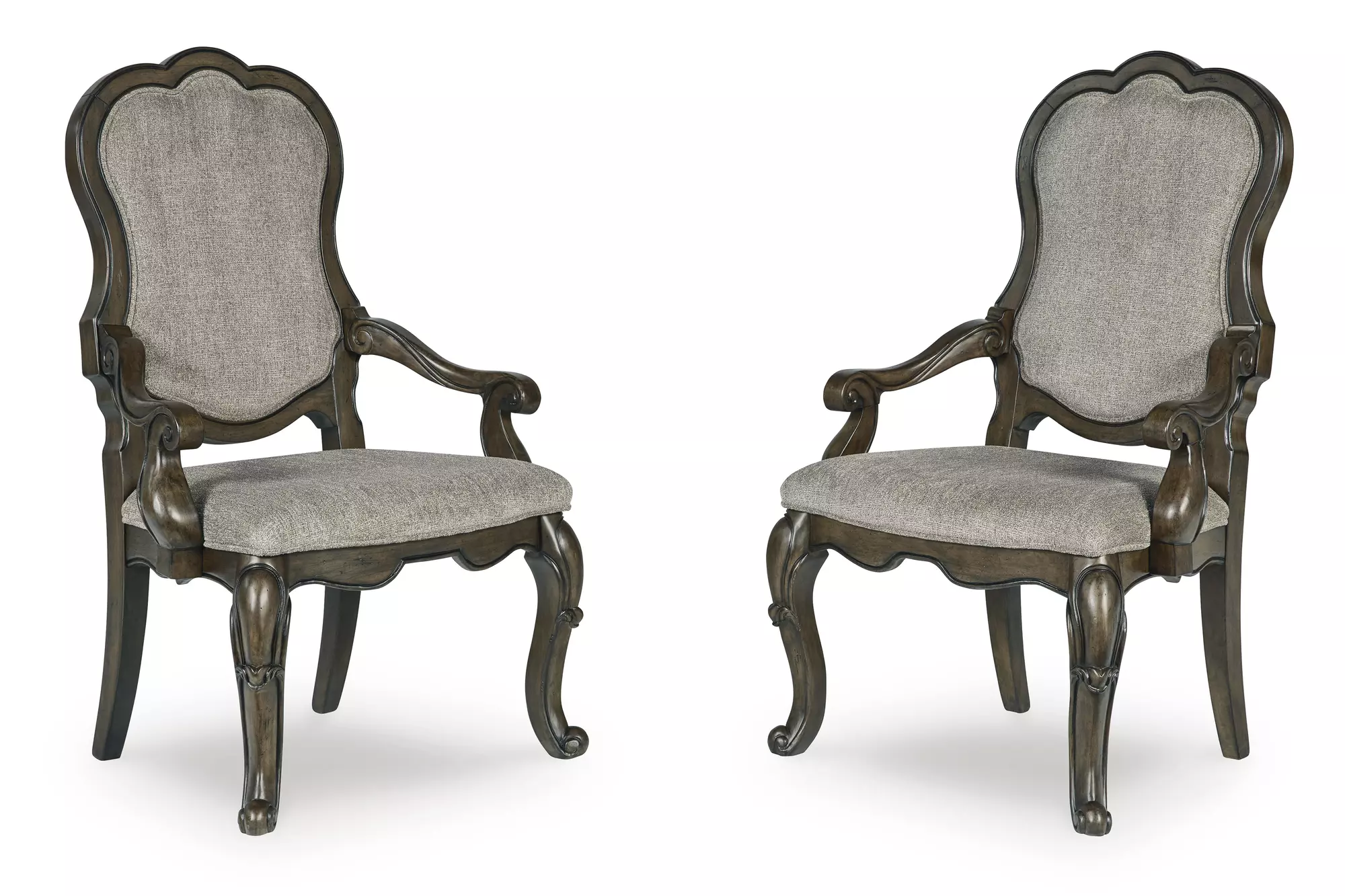 Product DetailsMade with wood and cast resin | Dark brown finish | Foam cushioned seat and back with polyester upholstery | Ornate arms and cabriole legs | Assembly required