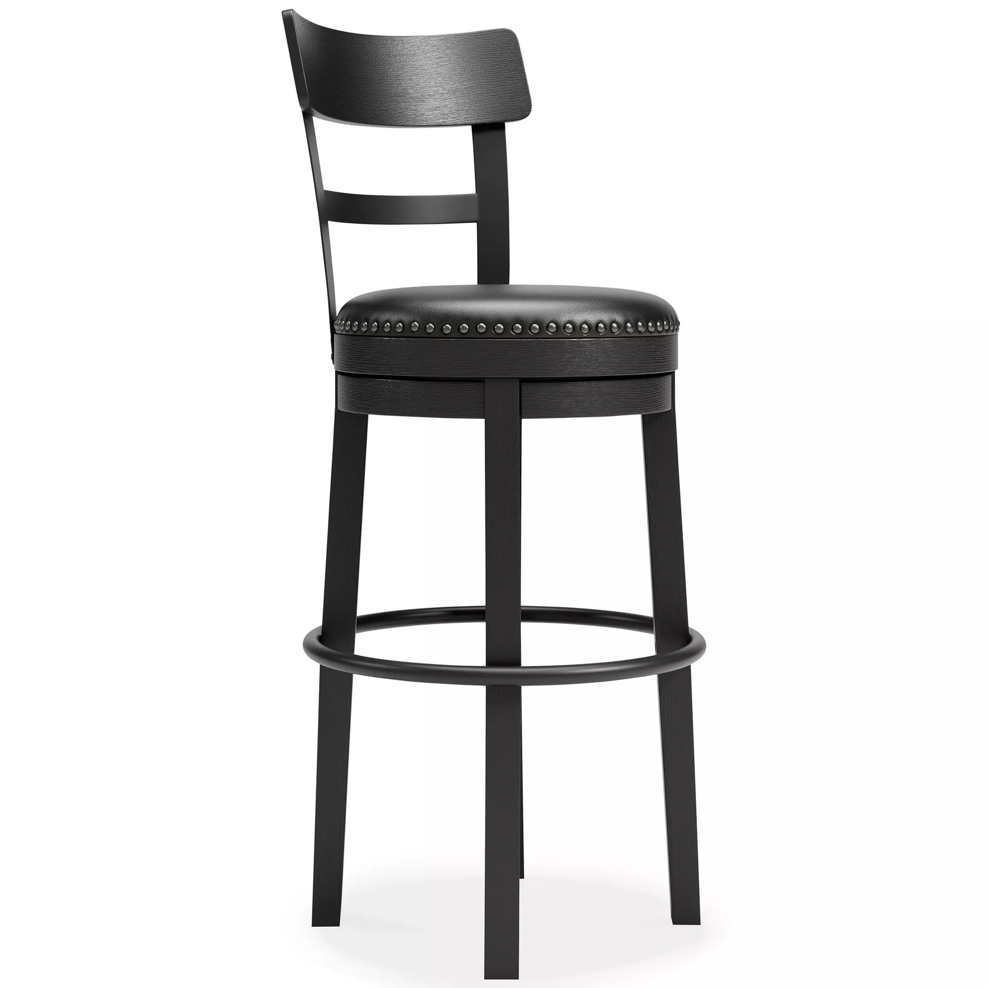 Bring a dash of drama to a kitchen island, table or counter with this upholstered swivel bar stool. The sturdy wood frame with contoured backrest is beautified with an antiqued black finish that’s a welcome change from the everyday ordinary. For your comfort and convenience, the bar stool seat is covered in a durable black faux leather designed for easy cleanup. Nailhead trim and metal accents perfect the aesthetic of this head-turning bar stool with 360-degree swivel.
