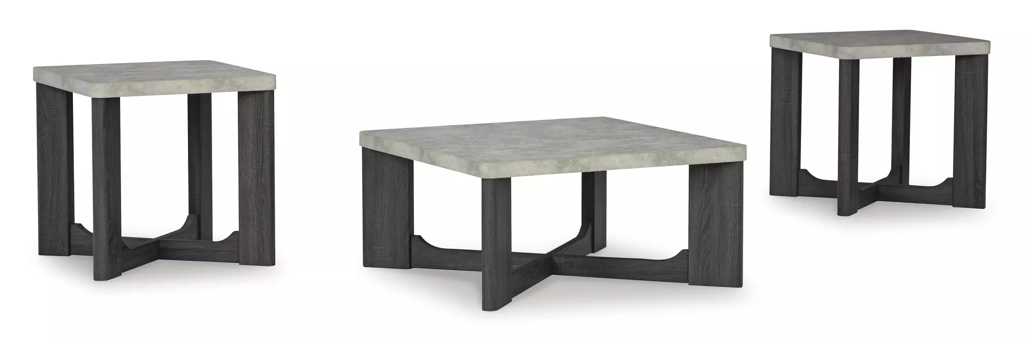 Includes coffee table and 2 end tables | Made with decorative laminates and MDF substrate | Frame with charcoal gray wood grain finish | Faux cement melamine tabletop | MEGA-TUFF® melamine surfaces are made of easy-clean melamine which is heat-, scratch-, water- and stain-resistant | Assembly required